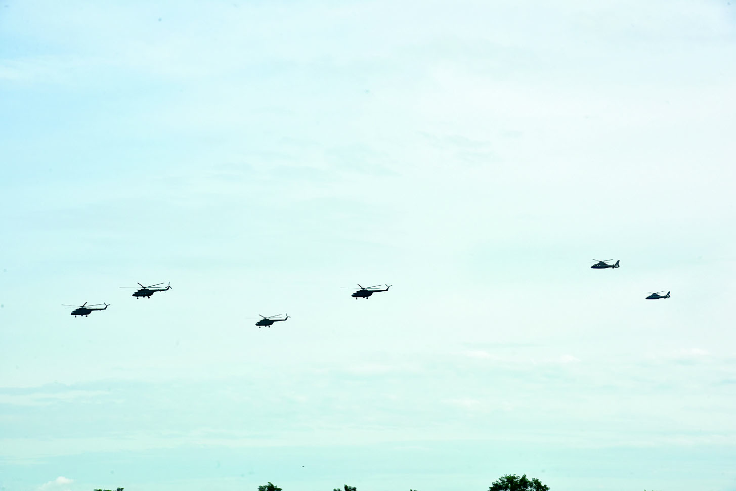ထို့နောက် လေယာဉ်၊ ရဟတ်ယာဉ်များ သရုပ်ပြအုပ်ဖွဲ့ပျံသန်းအလေးပြုခြင်းနှင့် စွမ်းရည်ပြသခြင်းများကို ဆောင်ရွက်ရာ Mi-17 ရဟတ်ယာဉ် လေးစင်း၊ Eurocopter ရဟတ်ယာဉ် နှစ်စင်းတို့က Composite Formation ပုံစံဖြင့်လည်းကောင်း ၊ Bell – 206 ရဟတ်ယာဉ် နှစ်စင်း၊ H-125 ရဟတ်ယာဉ် နှစ်စင်းတို့က Composite Box Formation ပုံစံဖြင့်လည်းကောင်း၊ MTX-1B ကင်းထောက်လေယာဉ် တစ်စင်း၊ MTX-A ကင်းထောက်လေယာဉ်တစ်စင်းနှင့် Grob-120 TP အမောင်းသင်လေယာဉ် တစ်စင်းတို့က Trail Formation ပုံစံဖြင့်လည်းကောင်း၊ ATR-72 သယ်ယူ ပို့ဆောင်ရေးလေယာဉ် တစ်စင်း၊ Beech-1900D သယ်ယူပို့ဆောင်ရေးလေယာဉ် နှစ်စင်းတို့က Composite Arrow Head Formation ပုံစံဖြင့်လည်းကောင်း၊ K-8 ဂျက်တိုက်လေယာဉ် လေးစင်းတို့က Box Formation ပုံစံဖြင့်လည်းကောင်း၊ MiG-29 ဘက်စုံသုံး ဂျက်တိုက်လေယာဉ် ငါးစင်းက Arrow Head Formation ပုံစံဖြင့်လည်းကောင်း၊ Su-30 SME ဘက်စုံသုံး အကြီးစားဂျက်တိုက် လေယာဉ် သုံးစင်းက Arrow Head Formation ပုံစံဖြင့်လည်းကောင်း အသီးသီးသရုပ်ပြပျံသန်း ကြသည်။