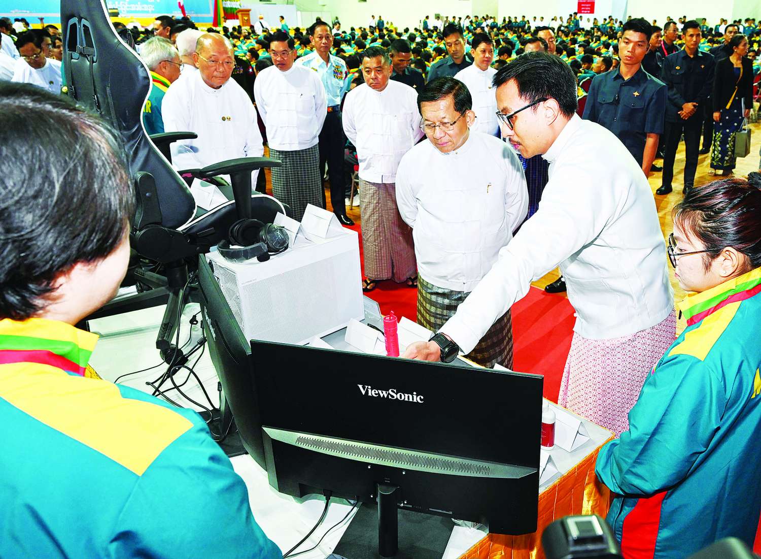 ယင်းနောက် နိုင်ငံတော်ယာယီသမ္မတ နိုင်ငံတော်လုံခြုံရေးနှင့် အေးချမ်းသာယာရေးကော်မရှင်ဥက္ကဋ္ဌက (၃၃)ကြိမ်မြောက် အရှေ့တောင်အာရှအားကစားပြိုင်ပွဲသို့ ဝင်ရောက်ယှဉ်ပြိုင်မည့်အားကစားအဖွဲ့များအား လိုက်လံနှုတ်ဆက်အားပေးစကားပြောကြားပြီး အားကစားအဖွဲ့များအသုံးပြုမည့် အားကစားနည်းများအလိုက် အသုံးအဆောင်ပစ္စည်းများအား ပြခန်းတစ်ခုချင်းစီအလိုက် လိုက်လံကြည့်ရှုစစ်ဆေးကာ တာဝန်ရှိသူများ၏ တင်ပြချက်များအပေါ် လိုအပ်သည်များလမ်းညွှန်မှာကြား ဖြည့်ဆည်းဆောင်ရွက်ပေးခဲ့ကြောင်း သတင်းရရှိသည်။