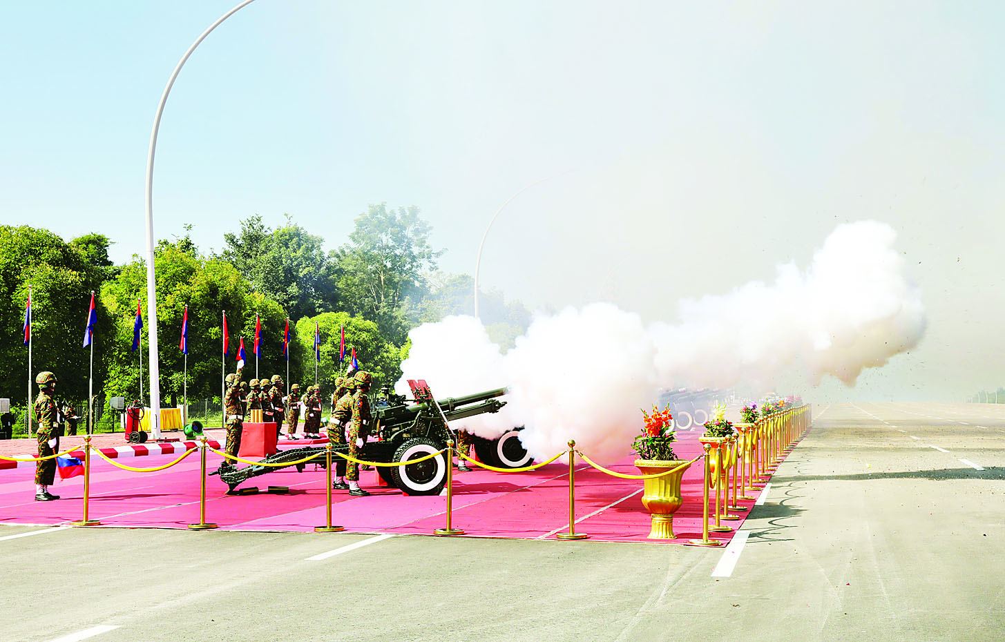 ယင်းနောက် နိုင်ငံတော်ယာယီသမ္မတ နိုင်ငံတော်လုံခြုံရေးနှင့်အေးချမ်းသာယာရေးကော်မရှင်ဥက္ကဋ္ဌနှင့် ဘယ်လာရုစ်သမ္မတနိုင်ငံသမ္မတတို့သည် ဂုဏ်ပြုခံစင်မြင့်၌ နေရာယူပြီး ဂုဏ်ပြုတပ်ဖွဲ့၏အလေးပြုခြင်းကို ခံယူကြသည်။ ထိုသို့ ဂုဏ်ပြုတပ်ဖွဲ့၏ အလေးပြုခြင်းကို ခံယူနေချိန်တွင် ဂုဏ်ပြုအမြောက်တပ်ဖွဲ့မှလည်း အမြောက် ၂၁ ချက်ကို စစ်ရေးပြအခမ်းအနားဖြင့် ဂုဏ်ပြုပစ်ဖောက်သည်။
