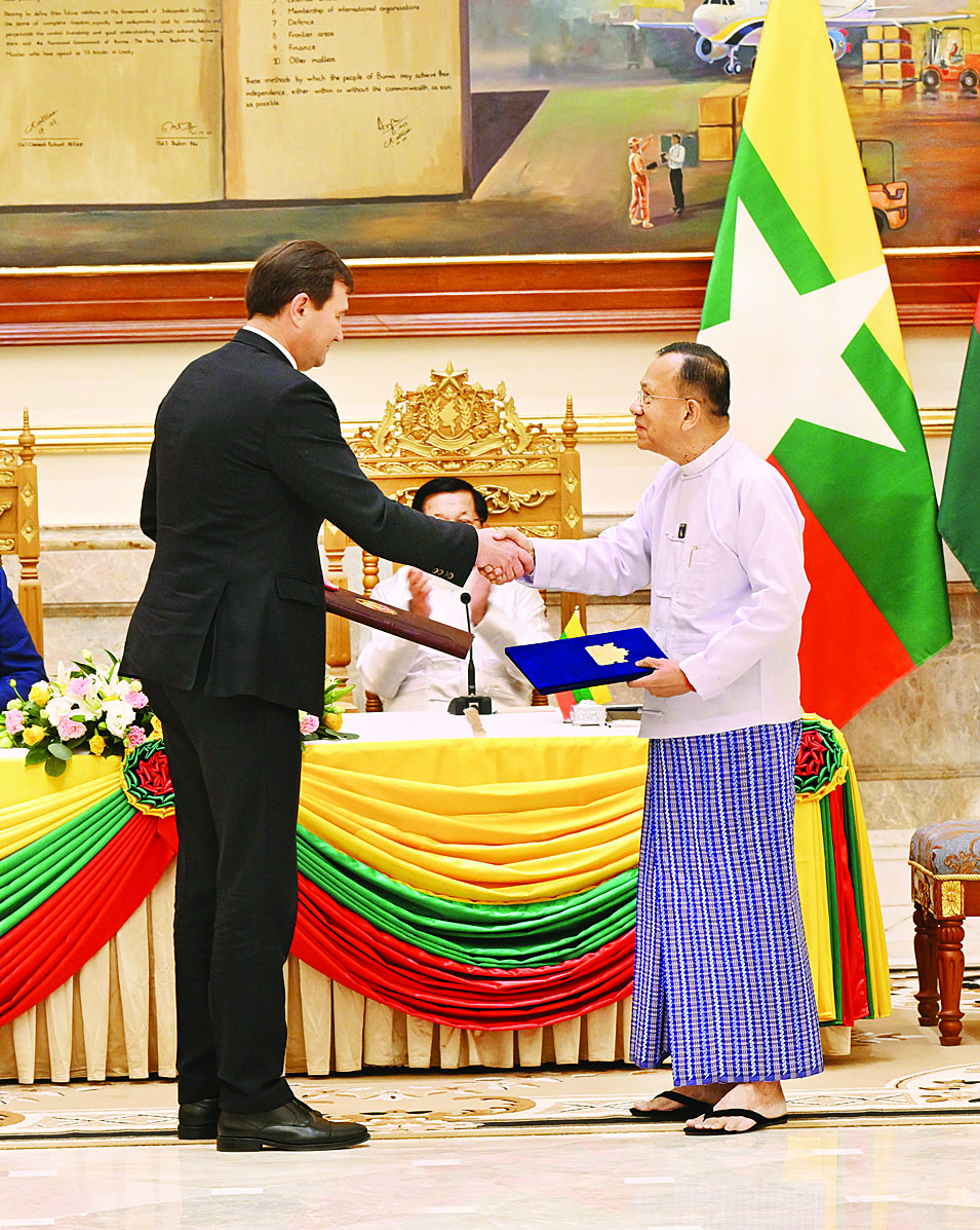 ယင်းနောက် ပြည်ထောင်စုသမ္မတမြန်မာနိုင်ငံတော်နှင့် ဘယ်လာရုစ်သမ္မတနိုင်ငံတို့အကြား နားလည်မှုစာချွန်လွှာလက်မှတ်ရေးထိုးပွဲကို ဆက်လက်ကျင်းပပြုလုပ်ရာ သိပ္ပံနှင့်နည်းပညာဆိုင်ရာ ပူးပေါင်းဆောင်ရွက်မှု နားလည်မှုစာချွန်လွှာများ၊ အကောက်ခွန်ဆိုင်ရာကိစ္စရပ်များတွင် ပူးပေါင်းဆောင်ရွက်ရေးဆိုင်ရာ နားလည်မှုစာချွန်လွှာများ၊ ပို့ကုန်ချေးငွေမူဘောင်သဘောတူညီချက်နှင့် နိုင်ငံတော်အဆင့် စံချိန်စံညွှန်းသတ်မှတ်ခြင်း၊ အရည်အသွေးကိုက်ညီမှု စစ်ဆေးခြင်း၊ တိကျစွာ တိုင်းတာခြင်းနှင့် အသိအမှတ်ပြုခြင်းနယ်ပယ်တို့တွင် ပူးပေါင်းဆောင်ရွက်ရေးဆိုင်ရာ နားလည်မှုစာချွန်လွှာများ၊ နှစ်နိုင်ငံပူးပေါင်းဆောင်ရွက်မှု မြှင့်တင်ရေးဆိုင်ရာ လမ်းပြမြေပုံ၊ ကုန်သွယ်ရေး၊ စီးပွားရေး၊ သိပ္ပံ၊ နည်းပညာနှင့် ယဉ်ကျေးမှုဆိုင်ရာ ပူးပေါင်းဆောင်ရွက်မှုစာချွန်လွှာများ၊ တရားမဝင်နှင့် ကူးသန်းရောင်းဝယ်ရေးဆိုင်ရာကိစ္စရပ်များတွင် ဥပဒေရေးရာ အပြန်အလှန် အကူအညီပေးရေးသဘောတူစာချုပ်နှင့် ရင်းနှီးမြှုပ်နှံမှုမြှင့်တင်ရေးဆိုင်ရာ နားလည်မှုစာချွန်လွှာများအား နှစ်နိုင်ငံပြည်ထောင်စုဝန်ကြီးများနှင့် မြန်မာနိုင်ငံဆိုင်ရာ ဘယ်လာရုစ်နိုင်ငံ သံအမတ်ကြီးတို့က နိုင်ငံတော်ယာယီသမ္မတ နိုင်ငံတော် လုံခြုံရေးနှင့်အေးချမ်းသာယာရေးကော်မရှင်ဥက္ကဋ္ဌနှင့် ဘယ်လာရုစ်သမ္မတနိုင်ငံသမ္မတတို့ ရှေ့မှောက်တွင် လက်မှတ်များရေးထိုးကြပြီး စာချွန်လွှာများကို အပြန်အလှန် လဲလှယ်ကြသည်။