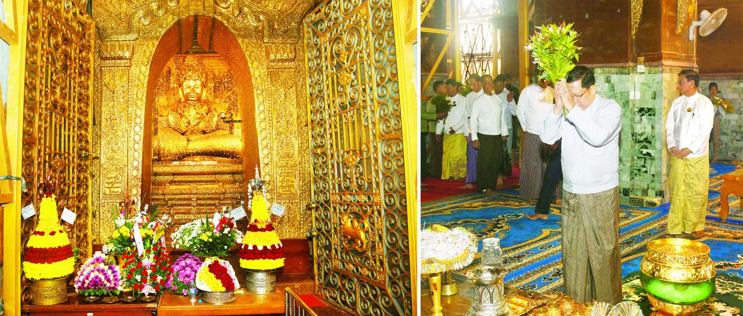 ဦးစွာ နိုင်ငံတော်ယာယီသမ္မတ နိုင်ငံတော်လုံခြုံရေးနှင့် အေးချမ်းသာယာရေးကော်မရှင်ဥက္ကဋ္ဌနှင့် ဇနီး၊ အဖွဲ့ဝင်များသည် မဟာမုနိဘုရားကြီးသို့ ရောက်ရှိကြပြီး ဘုရားဖူးလာမိဘပြည်သူများအား ရင်းရင်းနှီးနှီးနှုတ်ဆက်သည်။ ထို့နောက် နိုင်ငံတော်ယာယီသမ္မတ နိုင်ငံတော်လုံခြုံရေးနှင့်အေးချမ်းသာယာရေးကော်မရှင်ဥက္ကဋ္ဌနှင့် ဇနီး၊ အဖွဲ့ဝင်များသည် မဟာမုနိဘုရားကြီးအား မြသပိတ်ဆွမ်းတော်၊ သစ်သီးဆွမ်းတော်နှင့် ပန်း၊ ရေချမ်း ကပ်လှူပူဇော်ကာ ဖူးမြော်ကြည်ညိုသည်။