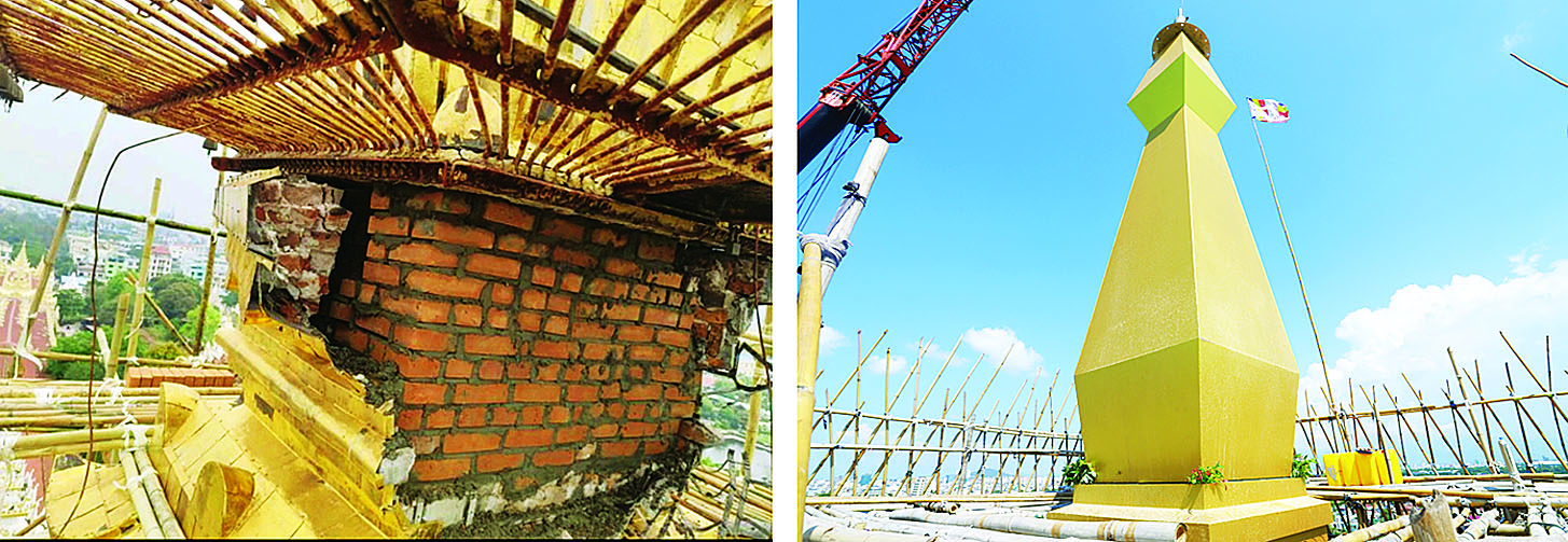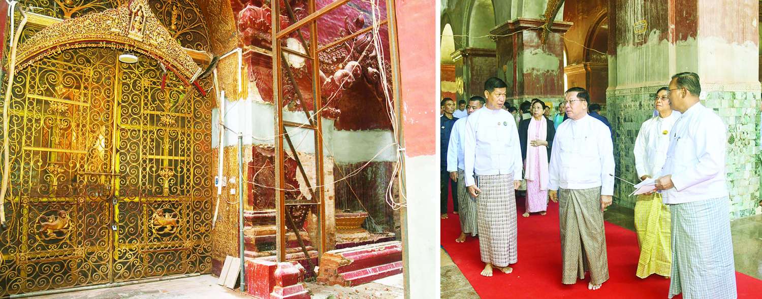 ထို့နောက် နိုင်ငံတော်ယာယီသမ္မတ နိုင်ငံတော်လုံခြုံရေးနှင့်အေးချမ်းသာယာရေးကော်မရှင်ဥက္ကဋ္ဌနှင့် အဖွဲ့ဝင်များသည် မဟာမုနိဘုရားကြီးအား လက်ယာရစ်လှည့်လည်၍ ဘုရားကြီးရှိ သာသနိကအဆောက်အဦများတွင် ငလျင်ဒဏ်ကြောင့် ထိခိုက်ပျက်စီးခဲ့ရမှုများအား ရှေးမူမပျက် ပြန်လည်ပြုပြင်တည်ဆောက်မွမ်းမံခြင်းလုပ်ငန်းများ ဆောင်ရွက်ထားရှိမှုအခြေအနေများကို ကြည့်ရှုစစ်ဆေးပြီး တာဝန်ရှိသူများ၏ တင်ပြချက်များအပေါ် ပြန်လည်ပြုပြင်ခြင်းလုပ်ငန်းများ၊ အသစ်တည်ဆောက်ရသည့်လုပ်ငန်းများ ဆောင်ရွက်ရာတွင် ရေရှည်တည်တံ့ခိုင်မြဲရေးနှင့် စနစ်တကျဖြစ်စေရေး တွက်ချက်ဆောင်ရွက်သွားရန်နှင့် အခြားလိုအပ်သည်များ လမ်းညွှန်မှာကြားသည်။