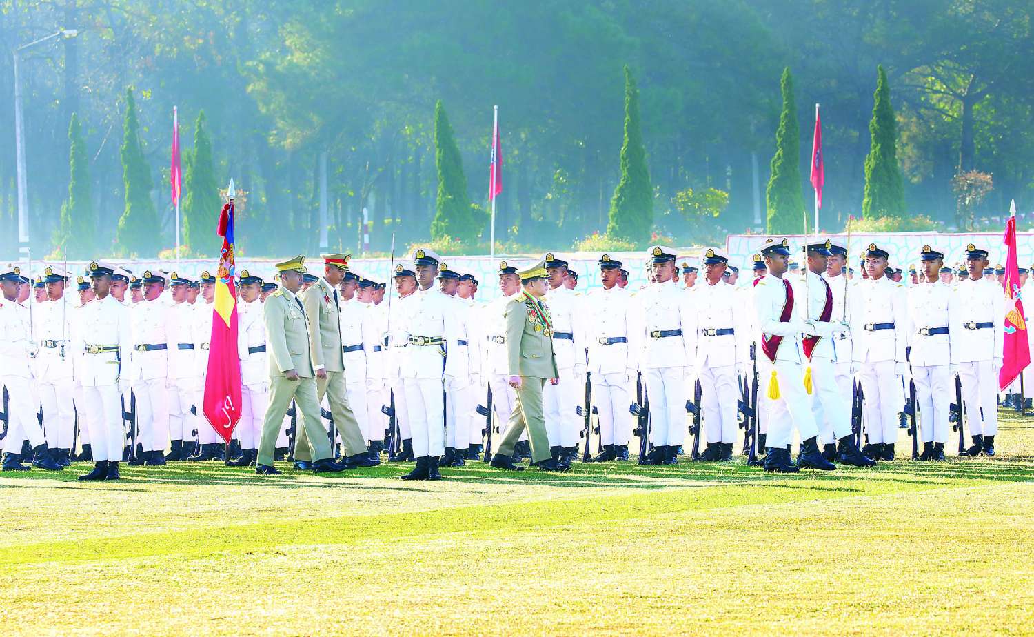 ယင်းနောက် နိုင်ငံတော်လုံခြုံရေးနှင့် အေးချမ်းသာယာရေးကော်မရှင်ဥက္ကဋ္ဌ တပ်မတော်ကာကွယ်ရေးဦးစီးချုပ် ဗိုလ်ချုပ်မှူးကြီး သတိုးမဟာသရေစည်သူ သတိုးသီရိသုဓမ္မ မင်းအောင်လှိုင်သည် ဗိုလ်လောင်းတပ်ခွဲများ၏ အလေးပြုခြင်းကို ခံယူပြီးနောက် စစ်ရေးပြအခမ်းအနားမှ ပြန်လည်ထွက်ခွာသည်။