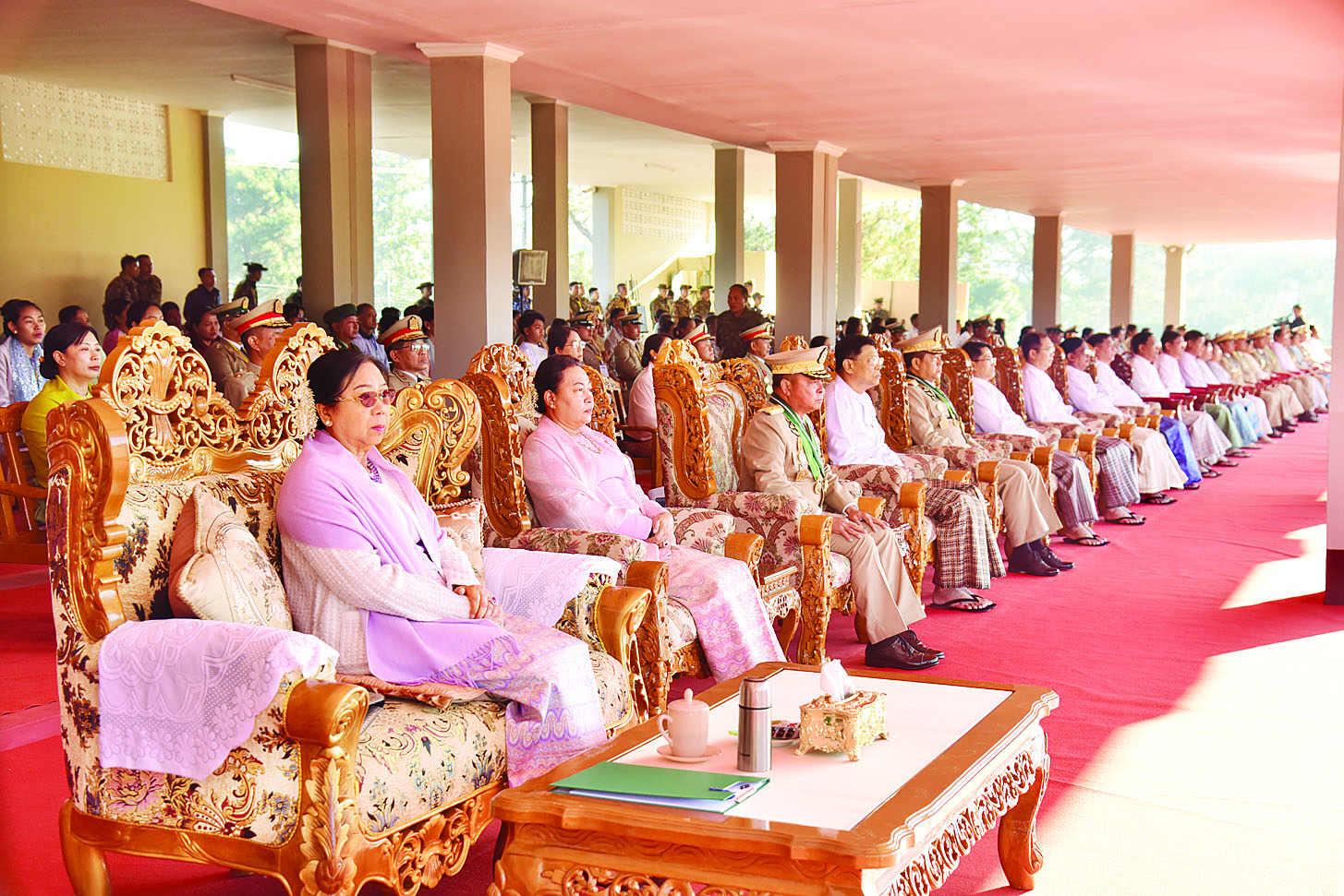အဆိုပါအခမ်းအနားသို့ နိုင်ငံတော်လုံခြုံရေးနှင့် အေးချမ်းသာယာရေးကော်မရှင်ဥက္ကဋ္ဌ တပ်မတော်ကာကွယ်ရေးဦးစီးချုပ်နှင့်အတူ ဇနီး ဒေါ်ကြူကြူလှ၊ ကာကွယ်ရေးဦးစီးချုပ် (ရေ) ဗိုလ်ချုပ်ကြီး ဇေယျကျော်ထင် ထိန်ဝင်းနှင့် ဇနီး၊ ကာကွယ်ရေးဦးစီးချုပ် (လေ) ဗိုလ်ချုပ်ကြီး ဇေယျကျော်ထင်စည်သူ ထွန်းအောင်နှင့် ဇနီး၊ ကာကွယ်ရေးဦးစီးချုပ်ရုံးမှ အဆင့်မြင့်တပ်မတော်အရာရှိကြီးများနှင့် ဇနီးများ၊ ပြည်ထောင်စုအဆင့်ပုဂ္ဂိုလ်များ၊ ပြည်ထောင်စုဝန်ကြီးများနှင့် ဇနီးများ၊ မန္တလေးတိုင်းဒေသကြီးဝန်ကြီးချုပ်၊ တိုင်းမှူးများ၊ တပ်မတော်နည်းပညာတက္ကသိုလ်ကျောင်းအုပ်ကြီး၊ ပြင်ဦးလွင်တပ်နယ်မှ တာဝန်ရှိသူများ၊ ကျောင်းဆင်းဗိုလ်လောင်းများ၏ မိဘဆွေမျိုးများနှင့် ဖိတ်ကြားထားသည့် ဧည့်သည့်တော်များ တက်ရောက်ကြသည်။
