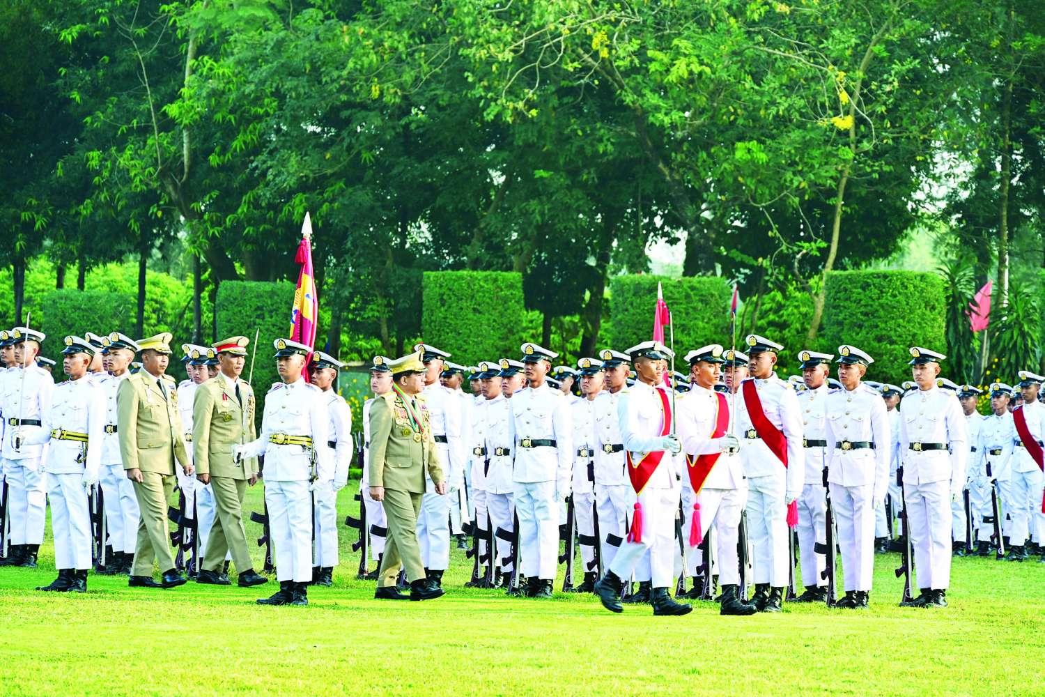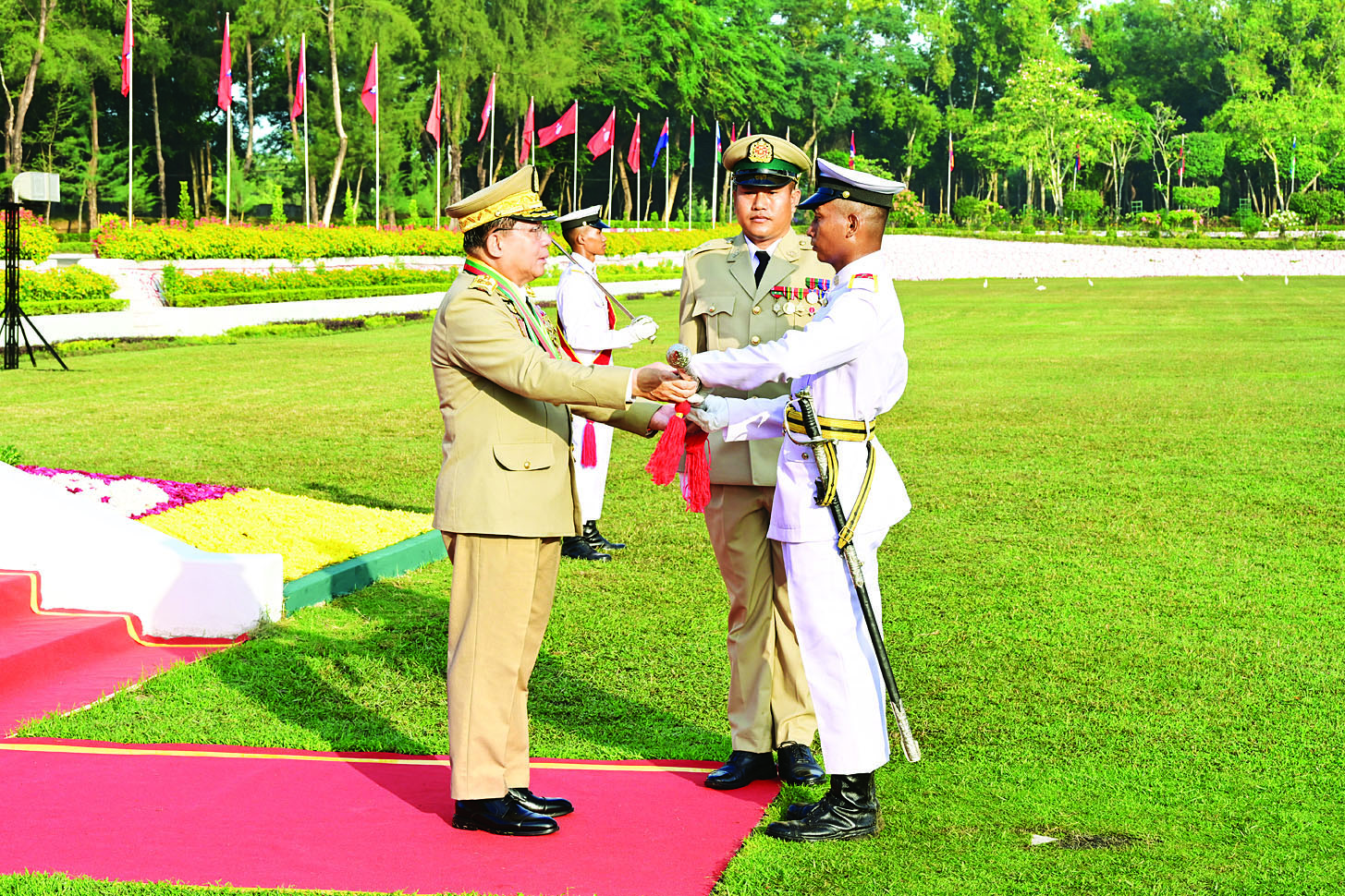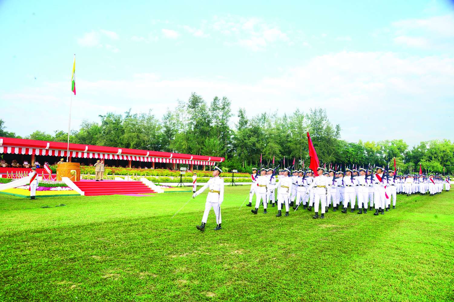 ယင်းနောက် နိုင်ငံတော်လုံခြုံရေးနှင့် အေးချမ်းသာယာရေးကော်မရှင်ဥက္ကဋ္ဌ တပ်မတော်ကာကွယ်ရေးဦးစီးချုပ် ဗိုလ်ချုပ်မှူးကြီး သတိုးမဟာသရေစည်သူ သတိုးသီရိသုဓမ္မ မင်းအောင်လှိုင်သည် ဗိုလ်လောင်းတပ်ခွဲများ၏ အလေးပြုခြင်းကိုခံယူပြီး စစ်ရေးပြအခမ်းအနားမှ ပြန်လည်ထွက်ခွာသည်။