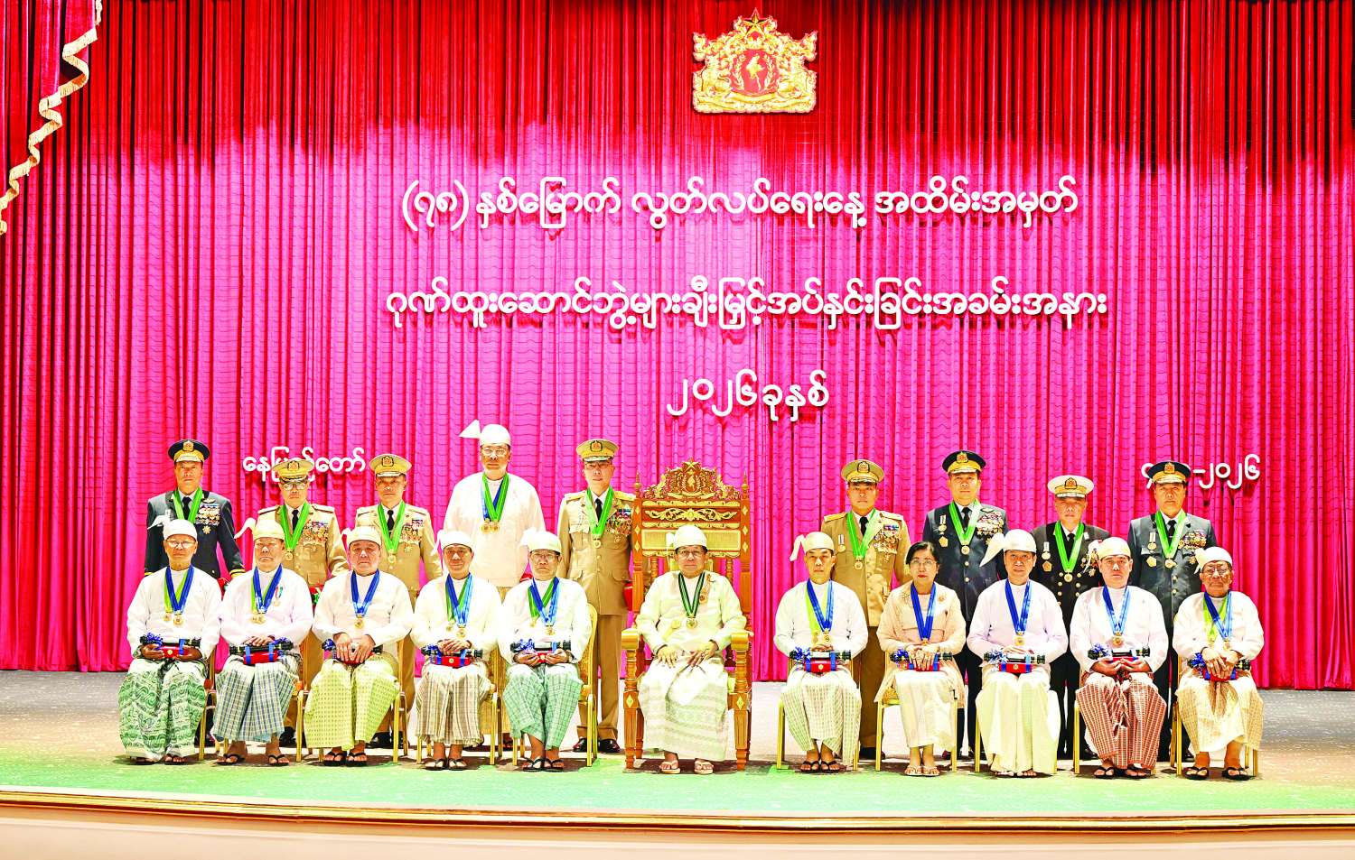 (၇၈) နှစ်မြောက် လွတ်လပ်ရေးနေ့အထိမ်းအမှတ်အနေဖြင့် ယနေ့ကျင်းပသည့် ဂုဏ်ထူးဆောင်ဘွဲ့များ ချီးမြှင့်အပ်နှင်းခြင်းအခမ်းအနားတွင် မြန်မာနှစ်ဆန်းတစ်ရက်နေ့ အထိမ်းအမှတ်အဖြစ် ၂၀၂၅ ခုနှစ်၊ ဧပြီလ ၁၇ ရက်နေ့က အမိန့်ကြော်ငြာစာအမှတ် ၆၀/၂၀၂၅ နှင့် ချီးမြှင့်ခဲ့သည့် စည်သူဘွဲ့ ၁၃ ဦး၊ သီရိပျံချီဘွဲ့ ၉ ဦး၊ ဇေယျကျော်ထင်ဘွဲ့ ၂ ဦး၊ ဝဏ္ဏကျော်ထင်ဘွဲ့ ၄ ဦး၊ အလင်္ကာကျော်စွာဘွဲ့ ၄ ဦး၊ မြန်မာအမျိုးသမီးများနေ့ အထိမ်းအမှတ်အဖြစ် ၂၀၂၅ ခုနှစ်၊ ဇူလိုင်လ ၂ ရက်နေ့တွင် အမိန့်ကြော်ငြာစာအမှတ် ၉၅/၂၀၂၅ နှင့် ချီးမြှင့်ခဲ့သည့် ဝဏ္ဏကျော်ထင်ဘွဲ့ ၃ ဦး၊ အမျိုးသားအောင်ပွဲနေ့အထိမ်း အမှတ်အဖြစ် ၂၀၂၅ ခုနှစ်၊ နိုဝင်ဘာလ ၁၄ ရက်နေ့က အမိန့်ကြော်ငြာစာအမှတ် ၂၀၃/၂၀၂၅ နှင့် ချီးမြှင့်ခဲ့သည့် သီရိပျံချီဘွဲ့ ၁ ဦး၊ ဇေယျကျော်ထင်ဘွဲ့ ၇ ဦး၊ ဝဏ္ဏကျော်ထင် ဘွဲ့ ၁၀ ဦး၊ အလင်္ကာကျော်စွာဘွဲ့ ၆ ဦး၊ သိပ္ပကျော်စွာဘွဲ့ ၁၇ ဦး၊ စုစုပေါင်းဘွဲ့ခံပုဂ္ဂိုလ် ၇၆ ဦးရှိသည့်အနက် အခမ်းအနားတက်ရောက်လက်ခံရယူသည့် ဘွဲ့ခံပုဂ္ဂိုလ်များကို သက်ဆိုင်ရာ ဂုဏ်ထူးဆောင်ဘွဲ့၏ အဆောင်အယောင်တံဆိပ်နှင့် ဂုဏ်ပြုစာလွှာများ ချီးမြှင့်အပ်နှင်းသွားမည်ဖြစ်ကြောင်း။