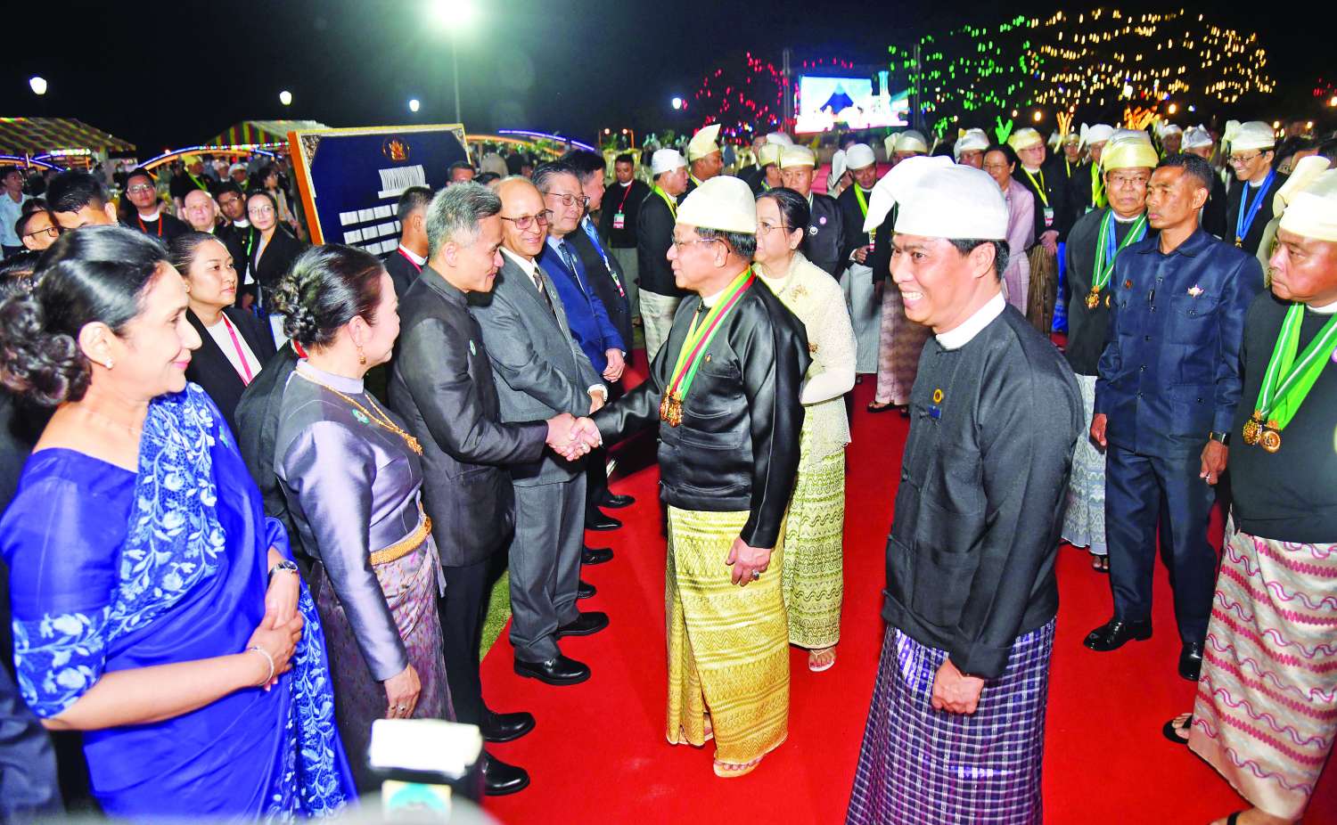 ထို့နောက် နိုင်ငံတော်ယာယီသမ္မတ နိုင်ငံတော်လုံခြုံရေးနှင့်အေးချမ်းသာယာရေးကော်မရှင်ဥက္ကဋ္ဌ ဗိုလ်ချုပ်မှူးကြီး သတိုးမဟာသရေစည်သူ သတိုးသီရိသုဓမ္မ မင်းအောင်လှိုင်နှင့် ဇနီးဒေါ်ကြူကြူလှတို့သည် ဂုဏ်ပြုဆောင်ခန်းမ ဥပစာမြက်ခင်းပြင်သို့ရောက်ရှိကြပြီး နိုင်ငံတော်လုံခြုံရေးနှင့်အေးချမ်းသာယာရေးကော်မရှင်ဥက္ကဋ္ဌနှင့်ဇနီးတို့နှင့်အတူ ဂုဏ်ပြုညစာစားပွဲအခမ်းအနားသို့ တက်ရောက်လာကြသည့် နိုင်ငံရေးပါတီများမှဥက္ကဋ္ဌများနှင့် ကိုယ်စားလှယ်များ၊ နိုင်ငံခြားသံရုံးများမှ သံအမတ်ကြီးများနှင့် သံရုံးတာဝန်ခံများ၊ ဂုဏ်ထူးဆောင်ကောင်စစ်ဝန်များနှင့် အထူးဖိတ်ကြားထားသည့် ဧည့်သည်တော်များကို ရင်းရင်းနှီးနှီး နှုတ်ဆက်သည်။