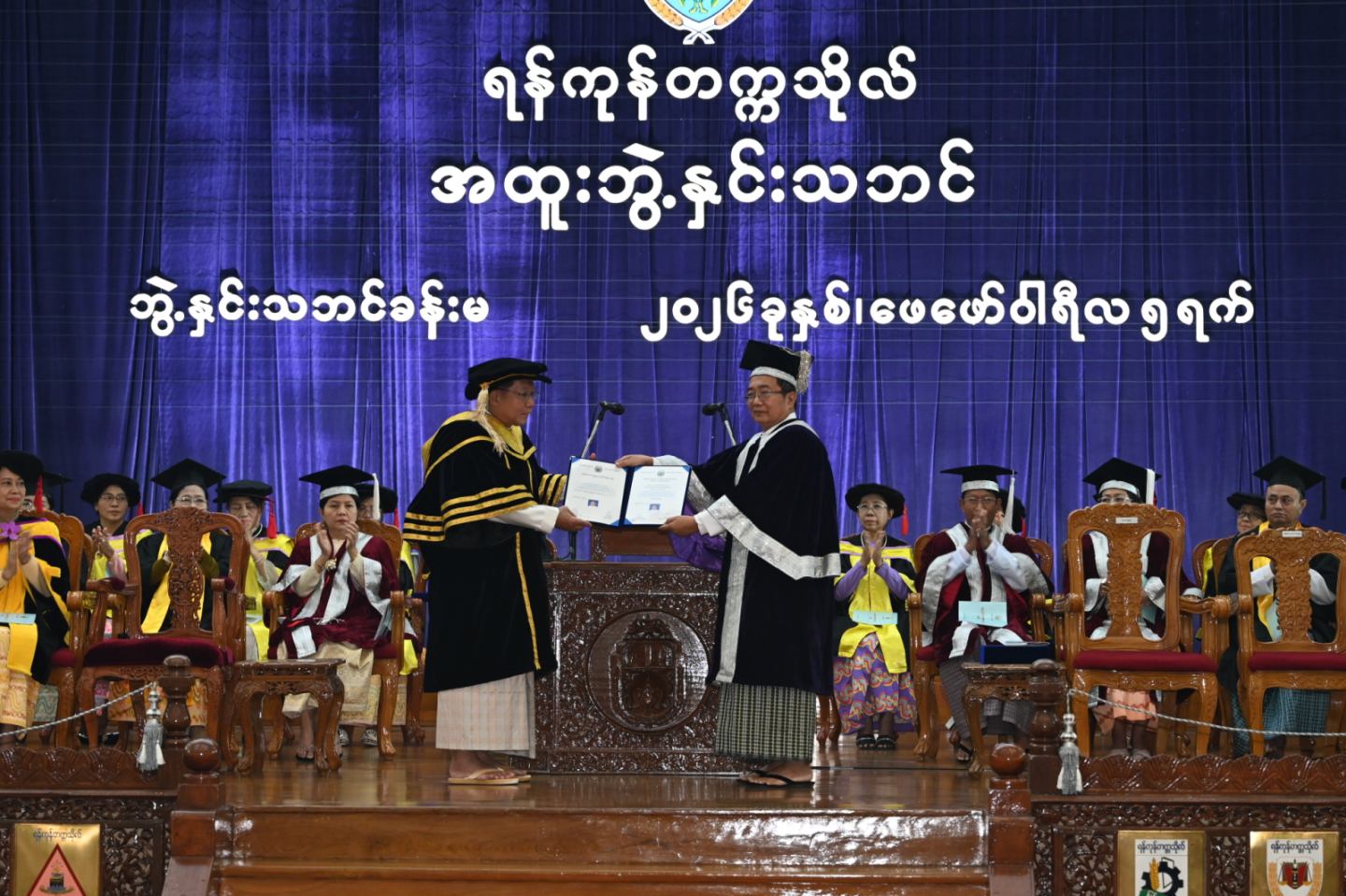 ထို့နောက် နိုင်ငံတော်ယာယီသမ္မတနိုင်ငံတော်လုံခြုံရေးနှင့် အေးချမ်းသာယာရေးကော်မရှင်ဥက္ကဋ္ဌ ဗိုလ်ချုပ်မှူးကြီးမင်းအောင်လှိုင်ထံ ရန်ကုန်တက္ကသိုလ် ပါမောက္ခချုပ်က ဂုဏ်ထူးဆောင်ပြည်သူ့ရေးရာစီမံခန့်ခွဲမှု ပါရဂူဘွဲ့ Honorary Doctor of Public Administration (D.P.A. honoris causa) ဘွဲ့အား အပ်နှင်းသည်။