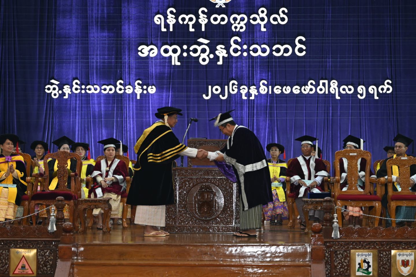 ဦးစွာ နိုင်ငံတော်ယာယီသမ္မတ နိုင်ငံတော်လုံခြုံရေးနှင့် အေးချမ်းသာယာရေးကော်မရှင်ဥက္ကဋ္ဌက ဘွဲနှင်းသဘင်ခန်းမအတွင်းနေရာယူပြီး သဟာယအဖွဲ့က ဘွဲ့နှင်းသဘင်အတွင်း ဝင်ရောက်နေရာယူကြသည်။