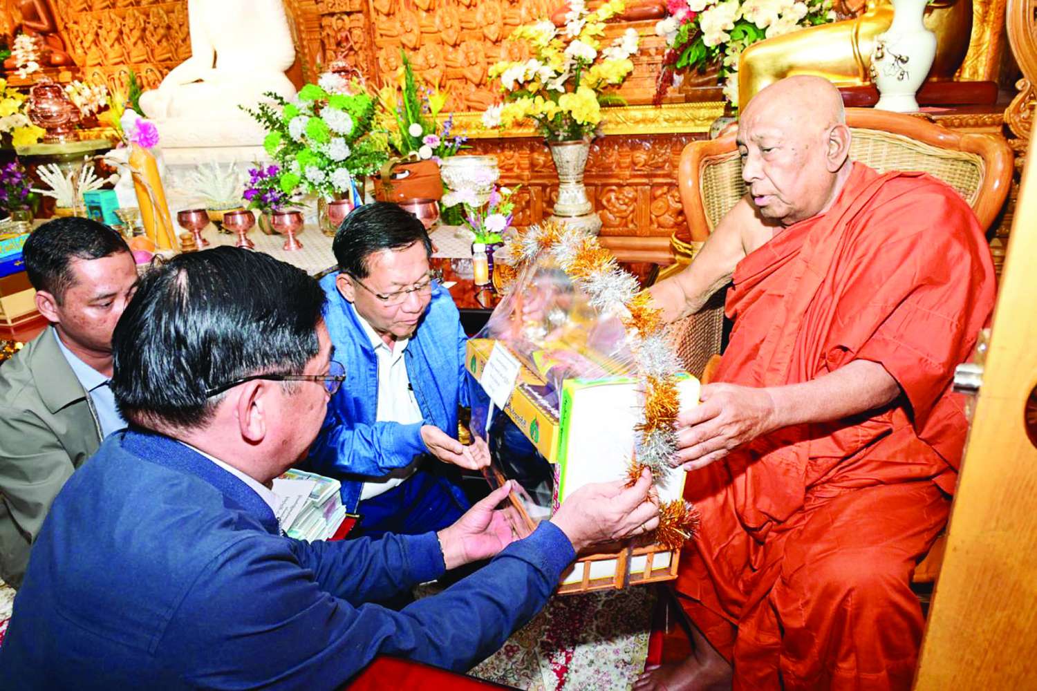 ထို့နောက် သီတဂူဆရာတော်ကြီးက နိုင်ငံတော်ယာယီသမ္မတ နိုင်ငံတော်လုံခြုံရေးနှင့်အေးချမ်းသာယာရေးကော်မရှင်ဥက္ကဋ္ဌအား ဓမ္မလက်ဆောင်များ ပေးအပ်သည်။ ယင်းနောက် နိုင်ငံတော်ယာယီသမ္မတ နိုင်ငံတော်လုံခြုံရေးနှင့်အေးချမ်းသာယာရေးကော်မရှင်ဥက္ကဋ္ဌက သီတဂူဆရာတော်ကြီးထံ လှူဖွယ်ဝတ္ထုပစ္စည်းများနှင့် မန္တလေးငလျင်ကြီး၏ ဘေးဒဏ်ကြောင့် ပြိုကျပျက်စီးမှုများ ဖြစ်ပေါ်ခဲ့ရသည့် မြတ်စွာဘုရားရှင်၏ ဓာတ်တော်မွေတော်များ ကိန်းဝပ်ရာ ဘုရား၊စေတီပုထိုးများ ပြုပြင်ရေးလုပ်ငန်းများတွင် အသုံးပြုရန်အတွက် အလှူငွေကျပ်သိန်း ၃၀၀ ကို ဆက်ကပ်လှူဒါန်းခဲ့သည်။