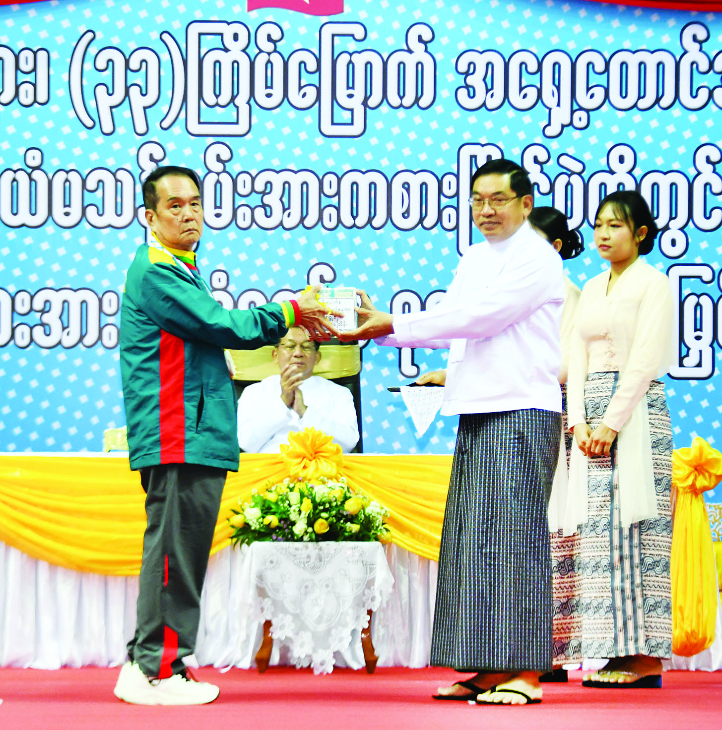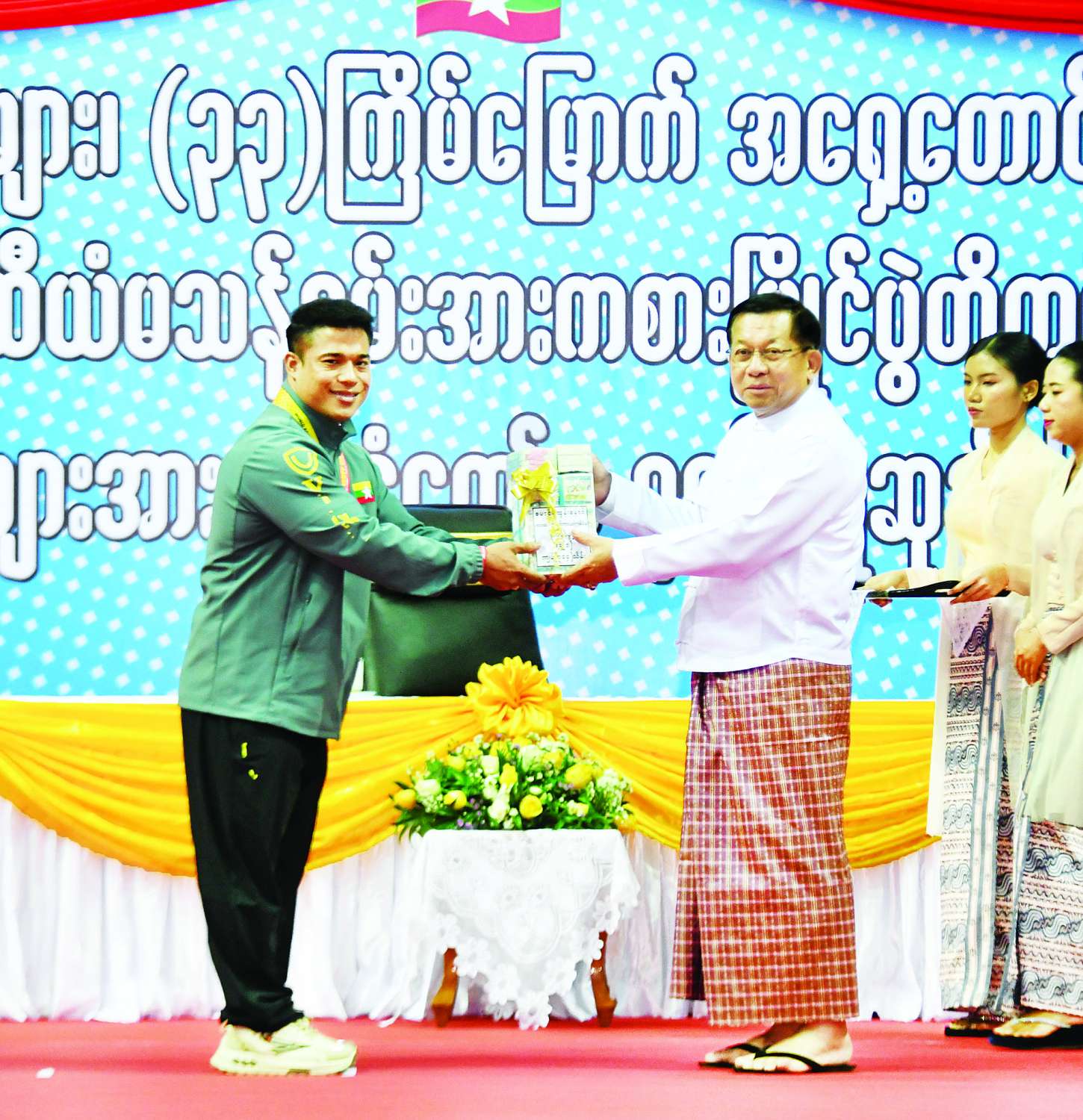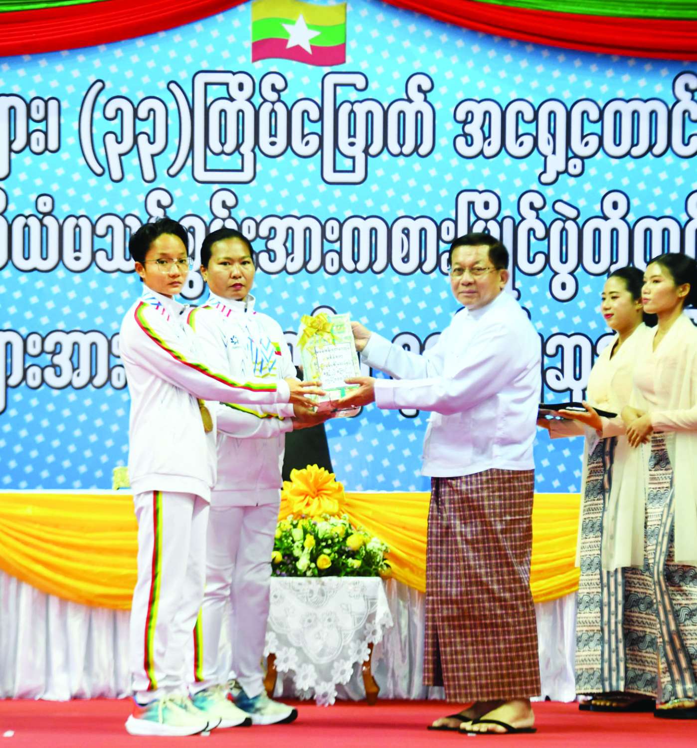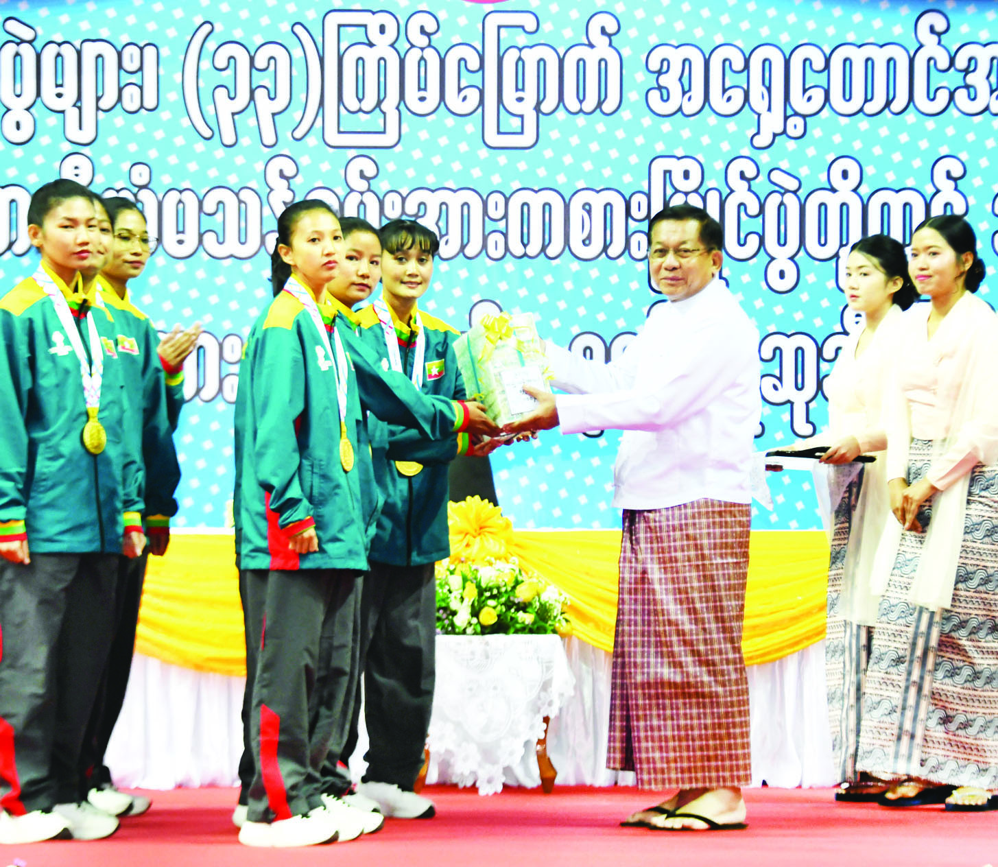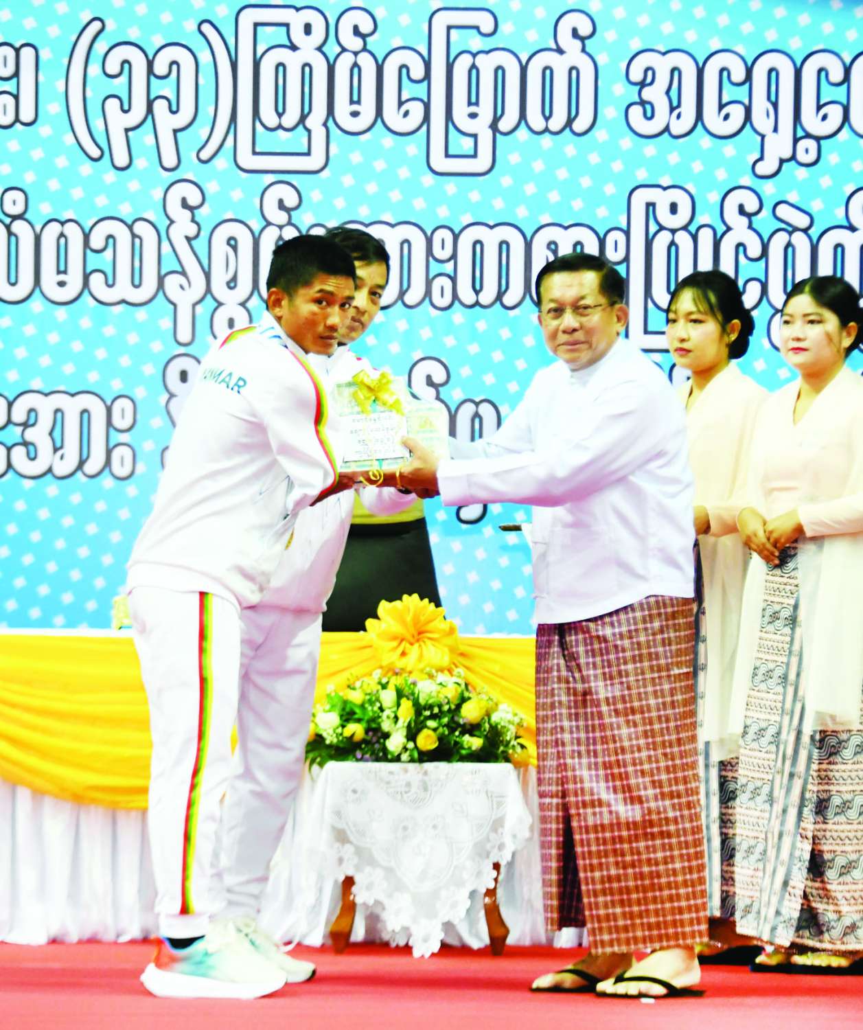ထို့နောက် (၈) ကြိမ်မြောက် ကမ္ဘာ့ဗိုဗီနမ်ချန်ပီယံရှစ်ပြိုင်ပွဲ၊ (၁၆) ကြိမ်မြောက် ကမ္ဘာ့ကာယဗလနှင့် ကာယကြံ့ခိုင်မှုအားကစားပြိုင်ပွဲ၊ (၃၃) ကြိမ်မြောက် အရှေ့တောင်အာရှအားကစားပြိုင်ပွဲနှင့် (၁၃) ကြိမ်မြောက် အာဆီယံမသန်စွမ်းအားကစားပြိုင်ပွဲတို့တွင် နိုင်ငံ့ဂုဏ်ဆောင်ခဲ့သည့် အားကစားသမား မောင်မယ်များအား နိုင်ငံတော်မှ ဂုဏ်ပြုချီးမြှင့်ပွဲအခမ်းအနားကို ကျင်းပပြုလုပ်ရာ နိုင်ငံတော်ယာယီသမ္မတ နိုင်ငံတော်လုံခြုံရေးနှင့် အေးချမ်းသာယာရေးကော်မရှင်ဥက္ကဋ္ဌက (၈) ကြိမ်မြောက် ကမ္ဘာ့ဗိုဗီနမ်ချန်ပီယံရှစ်ပြိုင်ပွဲတွင် ရွှေတံဆိပ်နှစ်ခုရရှိခဲ့ကြသည့် မမေဟန်နီအောင်လွင်နှင့် မနှင်းသက်ဝေ၊ (၁၆) ကြိမ်မြောက် ကမ္ဘာ့ကာယဗလနှင့် ကာယကြံ့ခိုင်မှုအားကစားပြိုင်ပွဲ၊ Men Bodybuilding 75 kg ပြိုင်ပွဲ၌ ရွှေတံဆိပ်တစ်ခုရရှိခဲ့သည့် မောင်ရဲထွန်းနောင်၊ (၃၃) ကြိမ်မြောက် အရှေ့တောင်အာရှအားကစားပြိုင်ပွဲ ခြင်းလုံးအားကစားနည်းတွင် အမျိုးသားအသင်းလိုက် Event-3 ပြိုင်ပွဲတွင် ရွှေတံဆိပ်တစ်ခုရရှိခဲ့သည့် အမျိုးသားအသင်းနှင့် အမျိုးသမီးအသင်းလိုက် Event-3 ပြိုင်ပွဲတွင် ရွှေတံဆိပ်တစ်ခုရရှိခဲ့သည့် အမျိုးသမီးအသင်း၊ ဘိလိယက်နှင့် စနူကာအားကစားနည်းတွင် ဘိလိယက်အမျိုးသားအသင်းလိုက်ပြိုင်ပွဲ၌ ရွှေတံဆိပ်တစ်ခုရရှိခဲ့သည့် ဘိလိယက်အမျိုးသား အသင်း၊ (၁၃) ကြိမ်မြောက် အာဆီယံမသန်စွမ်းအားကစားပြိုင်ပွဲ ရေကူးအားကစားနည်းတွင် မီတာ ၂၀၀ အလွတ်ကူး၊ မီတာ ၅၀ ရင်ပေါင်တန်းကူး၊ မီတာ ၅၀ အလွတ်ကူး၊ မီတာ ၁၀၀ အလွတ်ကူးပြိုင်ပွဲ လေးမျိုးလုံး၌ ရွှေတံဆိပ်လေးခုရရှိသည့် မောင်ညီညီလင်းထက်၊ မီတာ ၁၀၀ ရင်ပေါင်တန်းကူးပြိုင်ပွဲတွင် ရွှေတံဆိပ်တစ်ခုနှင့် မီတာ ၅၀ ရင်ပေါင်တန်းကူးပြိုင်ပွဲတွင် ငွေတံဆိပ်တစ်ခုရရှိခဲ့သည့် မောင်နန္ဒ စိုးမင်း၊ အလွတ်ကူးပြိုင်ပွဲများတွင် ရွှေတံဆိပ်တစ်ခုနှင့် ငွေတံဆိပ်တစ်ခုရရှိခဲ့သည့် ဒုတိယတပ်ကြပ် စိုးဝင်း၊ ရင်ပေါင်တန်းကူးပြိုင်ပွဲများတွင် ရွှေတံဆိပ်တစ်ခုနှင့် ငွေတံဆိပ်တစ်ခုရရှိခဲ့သည့် မောင်မင်းထူး၊ မီတာ ၁၀၀ ပက်လက်ကူးပြိုင်ပွဲတွင် ရွှေတံဆိပ်တစ်ခုနှင့် မီတာ ၂၀၀ အလွတ်ကူးပြိုင်ပွဲတွင် ကြေးတံဆိပ်နှစ်ခုရရှိခဲ့သည့် မောင်အောင်မြင့်မြတ်၊ ပြေးခုန်ပစ်အားကစားနည်းတွင် သံလုံးပစ်နှင့် လှံတံပစ်ပြိုင်ပွဲတို့၌ ရွှေတံဆိပ်နှစ်ခုရရှိခဲ့သည့် ဒုတိယအရာခံဗိုလ် တင်ညို၊ မီတာ ၄၀၀ ပြိုင်ပွဲတွင် ရွှေတံဆိပ်တစ်ခု၊ မီတာ ၂၀၀ ပြိုင်ပွဲတွင် ငွေတံဆိပ်တစ်ခု၊ မီတာ ၁၀၀ ပြိုင်ပွဲတွင် ကြေးတံဆိပ်တစ်ခုရရှိခဲ့သည့် မောင်အောင်မြင့်ဌေး၊ မီတာ ၂၀၀ ပြိုင်ပွဲတွင် ရွှေတံဆိပ်တစ်ခု၊ ငွေတံဆိပ်တစ်ခုရရှိသည့် တပ်ကြပ်ကြီး စိုးပေ၊ သံပြားပစ်နှင့် သ