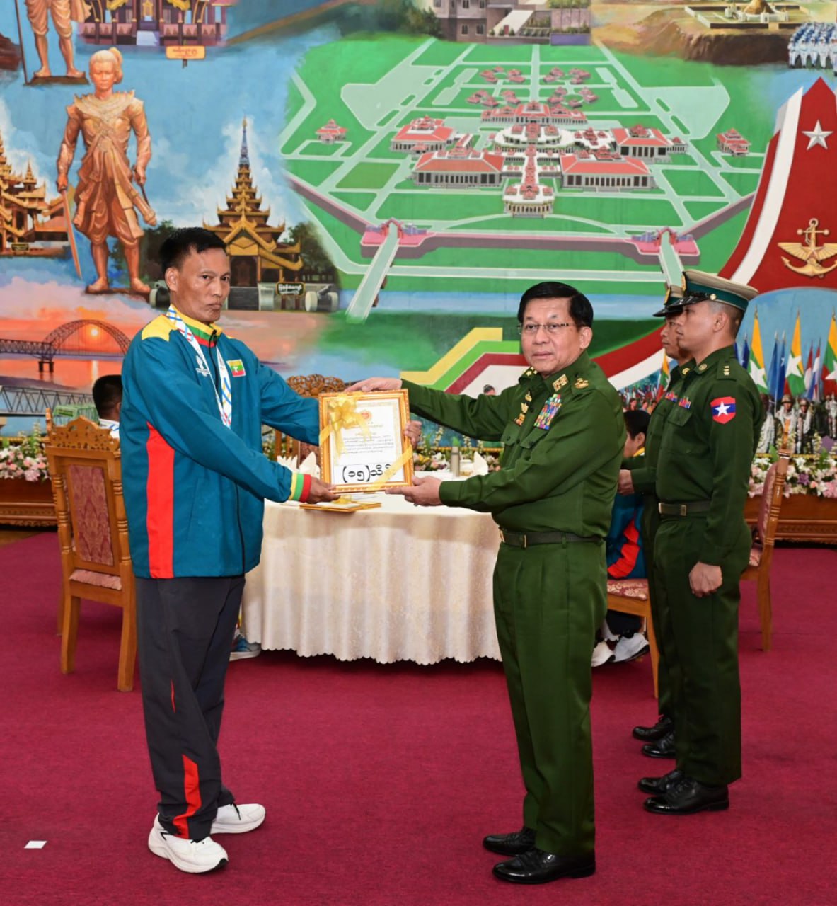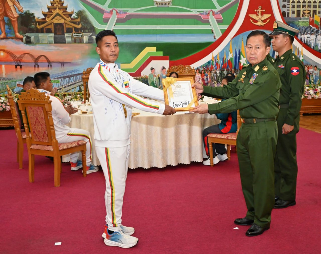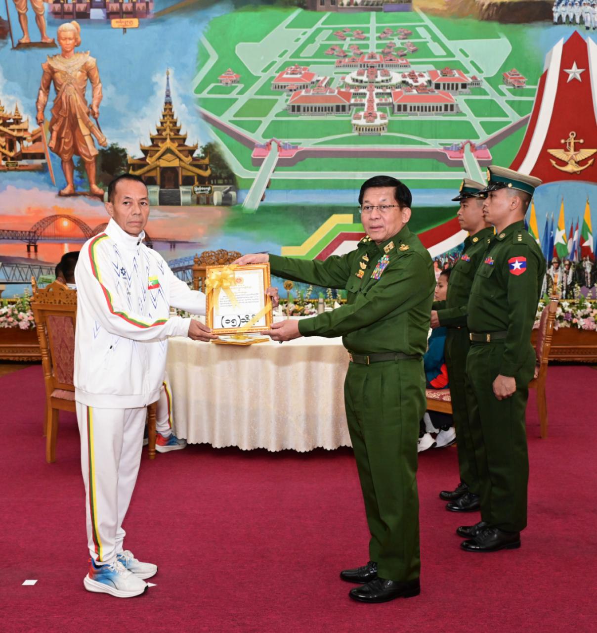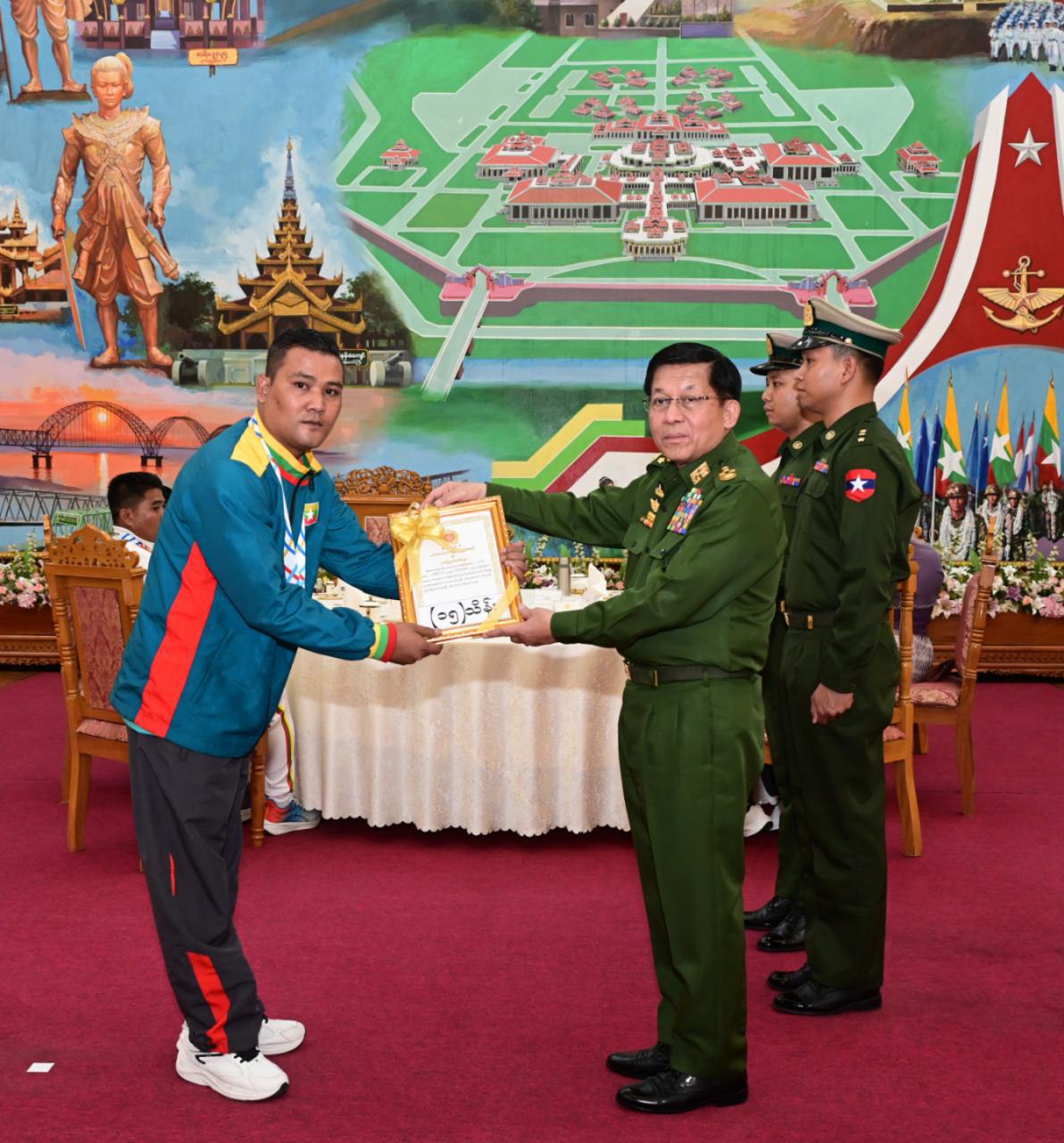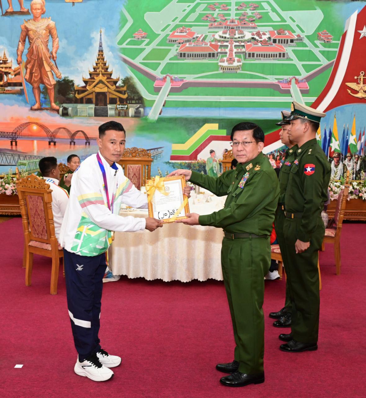 ထို့နောက် (၁၉)ကြိမ်မြောက် အာရှအားကစားပြိုင်ပွဲ၊ (၃၃)ကြိမ်မြောက် အရှေ့တောင်အာရှအားကစားပြိုင်ပွဲနှင့် (၁၃)ကြိမ်မြောက် အာဆီယံမသန်စွမ်းအားကစားပြိုင်ပွဲတို့တွင် ဆုတံဆိပ်များရယူဆွတ်ခူးပေးခဲ့ကြသည့် တပ်မတော်သားအားကစားသမားများနှင့်နည်းပြများအား ဂုဏ်ပြုဆုများချီးမြှင့်ခြင်း အခမ်းအနားကို ကျင်းပပြုလုပ်ရာ နိုင်ငံတော်လုံခြုံရေးနှင့်အေးချမ်းသာယာရေးကော်မရှင်ဥက္ကဋ္ဌ တပ်မတော်ကာကွယ်ရေးဦးစီးချုပ်က (၁၉)ကြိမ်မြောက် အာရှအားကစားပြိုင်ပွဲတွင် ပိုက်ကျော်ခြင်း (အသင်းလိုက်)ပြိုင်ပွဲ၌ ရွှေတံဆိပ်ဆုရရှိခဲ့သည့် အရာခံဗိုလ်သန့်ဇင်ဦး၊ (၁၃)ကြိမ်မြောက် အာဆီယံမသန်စွမ်းအားကစား ပြိုင်ပွဲတွင် ပြေးခုန်ပစ်(လှံတံပစ်) (တစ်ဦးချင်း) ပြိုင်ပွဲနှင့် (သံလုံးပစ်)(တစ်ဦးချင်း)ပြိုင်ပွဲတို့၌ ရွှေတံဆိပ်ဆုများရရှိခဲ့သည့် အရာခံဗိုလ် တင်ညို၊ (၃၃) ကြိမ်မြောက် အရှေ့တောင်အာရှအားကစားပြိုင်ပွဲတွင် ခြင်းလုံး(ကွင်းသွင်း)(အသင်းလိုက်)ပြိုင်ပွဲ၌ ငွေတံဆိပ်ဆုရရှိခဲ့သည့် ဒုတိယအရာခံဗိုလ် အောင်ဇော်၊ တပ်ကြပ်/၁၃ ကျော်ဇေယျာဝင်း၊ ဒုတိယတပ်ကြပ် စိုးပိုင်ဦး၊ (၁၃)ကြိမ်မြောက် အာဆီယံမသန်စွမ်းအားကစားပြိုင်ပွဲတွင် ပြေးခုန်ပစ်အားကစားနည်း၌ ရွှေတံဆိပ်ဆု၊ ငွေတံဆိပ်ဆုနှင့် ကြေးတံဆိပ်ဆုများရရှိအောင် နည်းပြပေးနိုင်ခဲ့သည့် ဒုတိယအရာခံဗိုလ် သက်ဝင်းတို့အား တပ်မတော်ကာကွယ်ရေးဦးစီးချုပ်၏ ဂုဏ်ထူးဆောင်လက်မှတ်၊ ဂုဏ်ပြုမှတ်တမ်းလွှာနှင့် ဂုဏ်ပြုချီးမြှင့်ငွေများကို တစ်ဦးချင်းပေးအပ်ချီးမြှင့်သည်။