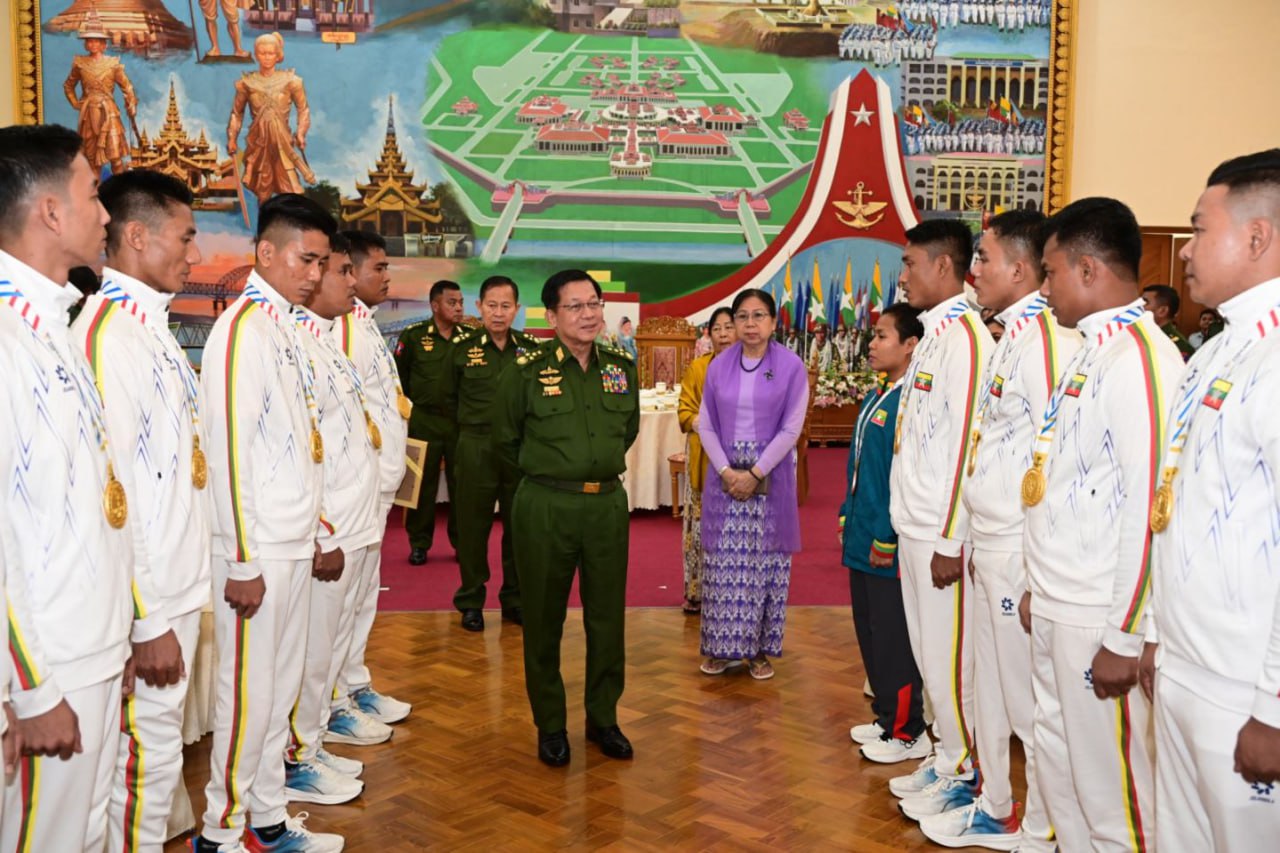 (၁၉)ကြိမ်မြောက် အာရှအားကစားပြိုင်ပွဲ၊ (၃၃)ကြိမ်မြောက် အရှေ့တောင်အာရှအားကစားပြိုင်ပွဲနှင့် (၁၃)ကြိမ်မြောက် အာဆီယံမသန်စွမ်းအားကစားပြိုင်ပွဲတို့တွင် ဆုတံဆိပ်များ ရယူဆွတ်ခူးပေးခဲ့ကြသည့် တပ်မတော်သားအားကစားသမားများနှင့် နည်းပြများအား ဂုဏ်ပြုဆုများချီးမြှင့်ခြင်းအခမ်းအနားကို ယနေ့မွန်းလွဲပိုင်းတွင် နေပြည်တော်ရှိ ဘုရင့်နောင်ရိပ်သာဧည့်ခန်းမဆောင်၌ ကျင်းပပြုလုပ်ရာ နိုင်ငံတော်လုံခြုံရေးနှင့် အေးချမ်းသာယာရေးကော်မရှင်ဥက္ကဋ္ဌ တပ်မတော်ကာကွယ်ရေးဦးစီးချုပ် ဗိုလ်ချုပ်မှူးကြီး မင်းအောင်လှိုင် တက်ရောက်အမှာစကားပြောကြားပြီး ဂုဏ်ပြုဆုများ ပေးအပ်ချီးမြှင့်သည်။