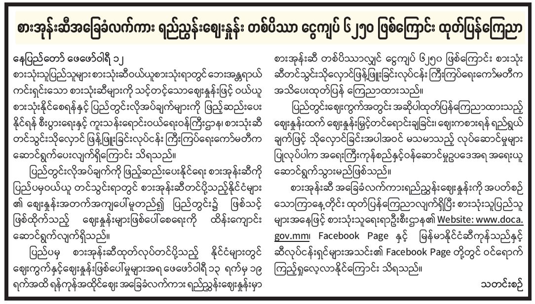 စားအုန်းဆီအခြေခံလက်ကား ရည်ညွှန်းဈေးနှုန်း တစ်ပိဿာ ငွေကျပ် ၆၂၅၀ ဖြစ်ကြောင်း ထုတ်ပြန်ကြေညာ