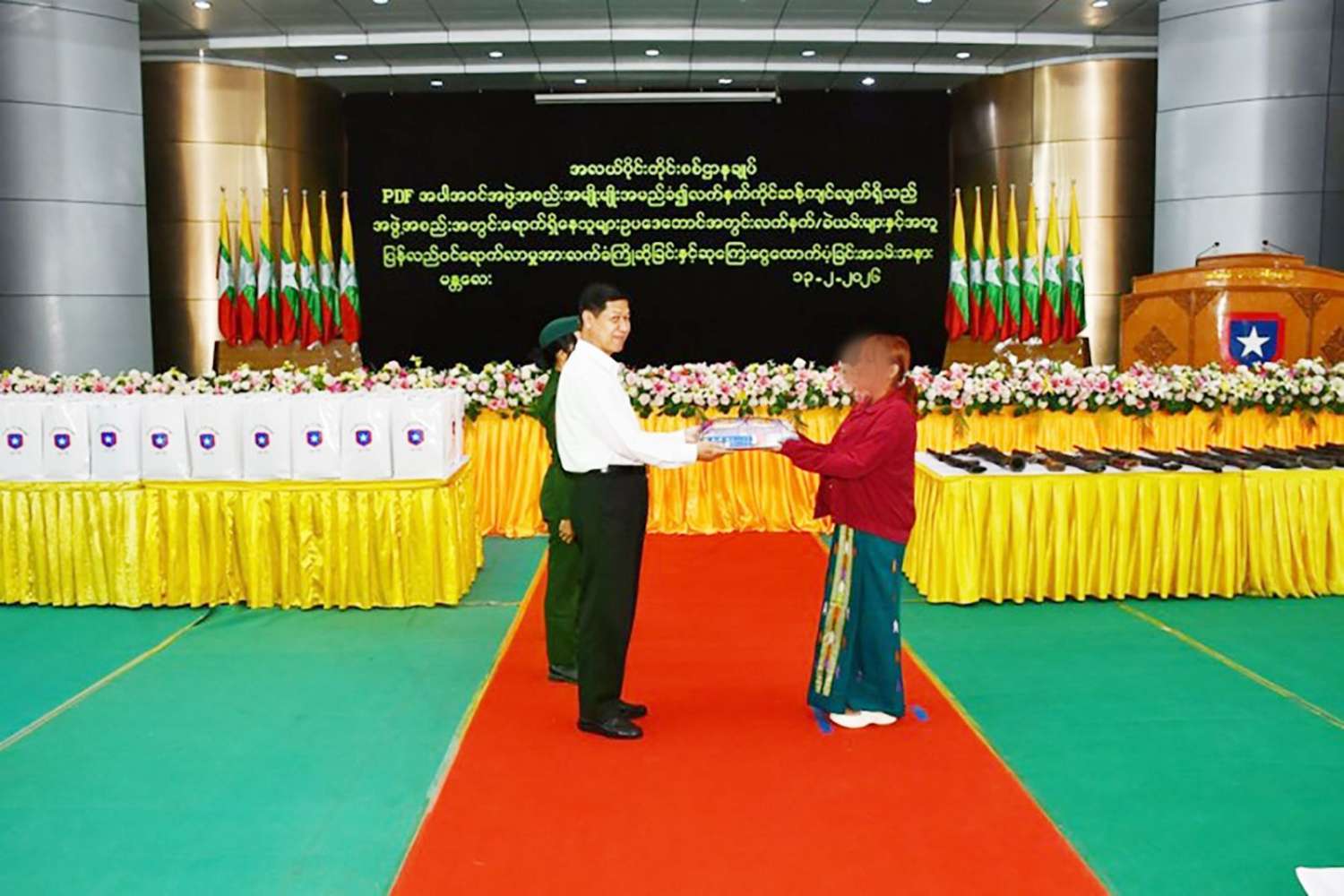 နိုင်ငံတော်အစိုးရသည် PDF အပါအဝင် အဖွဲ့အစည်းအမျိုးမျိုးအမည်ခံ၍ လက်နက်ကိုင်ဆန့်ကျင်လျက်ရှိသည့် အဖွဲ့အစည်းများအတွင်း ရောက်ရှိနေသူများအား ဥပဒေဘောင်အတွင်းသို့ ပြန်လည်ဝင်ရောက်ရန်ဖိတ်ခေါ်၍ ဥပဒေဘောင်အတွင်းသို့ ပြန်လည်ဝင်ရောက်လာကြသူများကိုလည်း လိုအပ်သည့်ကူညီပံ့ပိုးမှုများ ဆောင်ရွက်ပေးလျက်ရှိရာ နိုင်ငံတော်နှင့် တပ်မတော်၏ ငြိမ်းချမ်းရေးလုပ်ငန်းစဉ်များကို နားလည်သဘောပေါက်လာသည့် PDF အပါအဝင် အဖွဲ့အစည်းအမျိုးမျိုးအမည်ခံ အမျိုးသား ၁၄၁ ဦးနှင့် အမျိုးသမီး ၉ ဦး၊ ပေါင်း ၁၅၀ ဦးတို့သည် လက်နက်၊ ခဲယမ်းများနှင့်အတူ ဥပဒေဘောင်အတွင်းသို့ ဝင်ရောက်လာကြပြီး တာဝန်ရှိသူများက ကြိုဆိုလက်ခံ၍ မိဘအုပ်ထိန်းသူများထံ ပြန်လည်လွှဲပြောင်းအပ်နှံပွဲကို ယနေ့တွင် မန္တလေးမြို့၊ အလယ်ပိုင်းတိုင်းစစ်ဌာနချုပ်၊ ရန်အောင်မြင်ခန်းမ၌ ကျင်းပပြုလုပ်သည်။
