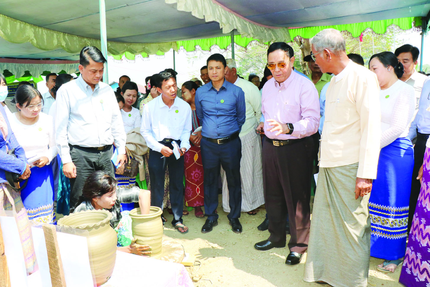 တွေ့ဆုံစဉ် ပြည်ထောင်စုဝန်ကြီးက အသေးစားစက်မှုလက်မှုလုပ်ငန်းဦးစီးဌာနက သရက်လိန်းကျေးရွာအုပ်စုနှင့် သူရဲဇီးကျေးရွာတို့တွင် ဇန်နဝါရီ ၂၇ ရက်မှ ဖေဖော်ဝါရီ ၁၀ ရက်အထိ ဝါးလက်မှုထည်သင်တန်းနှင့် အိုးလုပ်ငန်းအဆင့်မြှင့်တင်နိုင်ရေးအတွက် စဉ့်ရည်သုတ်လိမ်းခြင်း သင်တန်းကို တိုင်းဒေသကြီးအစိုးရအဖွဲ့နှင့် ပူးပေါင်းဖွင့်လှစ်ခဲ့ကြောင်း၊ အသင်းသားများ၏ မိသားစုဝင်ငွေတိုးပွားရေးအတွက် အိမ်မိုးအုတ်ကြွပ်များ ထုတ်လုပ်နိုင်ရေး လိုအပ်သည့် အရင်းအနှီး၊ နည်းပညာ၊ ဈေးကွက်ရရှိရေးနှင့် မြေနမူနာစမ်းသပ်မှုများကို မိမိတို့ဝန်ကြီးဌာနနှင့် စက်မှုဝန်ကြီးဌာနတို့ ပူးပေါင်းချိတ်ဆက်ဆောင်ရွက်လျက်ရှိကြောင်း၊ အသင်းသားတောင်သူများအနေဖြင့် စိုက်ပျိုးရေးဦးစီးဌာနမှ ထုတ်ပြန်ထားသော မျိုး၊ မြေ၊ ရေ၊ နည်းစသည့် စိုက်နည်းစနစ်များအတိုင်း လိုက်နာ ကျင့်သုံး၍ ပန်းတိုင်အထွက်နှုန်းရရှိအောင် ဆောင်ရွက်ကြစေလိုကြောင်း ပြောကြားပြီး ရွှေအိုးစက်မှု လက်မှုကုန်ထုတ်သမဝါယမအသင်းမှ ထုတ်လုပ်ရောင်းချနေသော မြေထည်ပစ္စည်းများ၊ မြေအိုးပြုလုပ်ခြင်း၊ မီးဖုတ်ခြင်းလုပ်ငန်းစဉ်များကို ကြည့်ရှုအားပေးသည်။