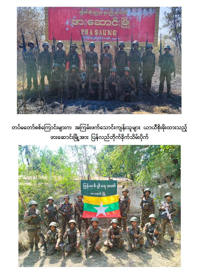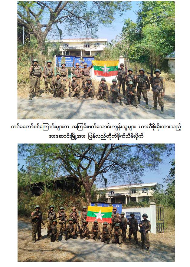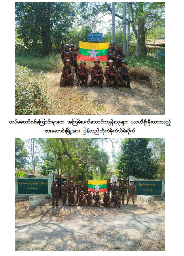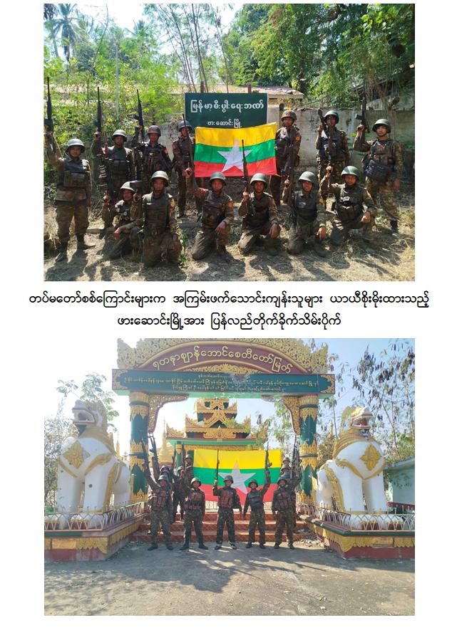 တပ်မတော်အနေဖြင့် နိုင်ငံတော်တည်ငြိမ်အေးချမ်းပြီး ဖွံ့ဖြိုးတိုးတက်စေရန်အတွက် အကြမ်းဖက်သောင်းကျန်းသူများ ယာယီစိုးမိုးထားပြီး အကြမ်းဖက်လုပ်ရပ်များလုပ်ဆောင်လျက်ရှိသည့် ဒေသများ၌ အကြမ်းဖက်ချေမှုန်းမှုစစ်ဆင်ရေးများကို ဒေသခံပြည်သူများ၏ ပူးပေါင်းပါဝင်မှုနှင့်အတူ ကြိုးပမ်းဆောင်ရွက်ပြီး ပြန်လည်ထိန်းချုပ်လျက်ရှိရာ KNPP ၊ KNDF အဖွဲ့များနှင့် PDF အမည်ခံ အကြမ်းဖက်သမားများ ယာယီစိုးမိုးထားသည့် ကယားပြည်နယ်၊ ဖားဆောင်းမြို့အား ယနေ့ဖေဖော်ဝါရီ ၁၅ ရက်တွင် တပ်မတော်က အပြည့်အဝပြန်လည်ထိန်းချုပ်ပြီး လိုအပ်သည့် နယ်မြေလုံခြုံရေးနှင့်နယ်မြေရှင်းလင်းရေးလုပ်ငန်းများ ဆက်လက်ဆောင်ရွက်လျက်ရှိကြောင်း သိရှိရသည်။