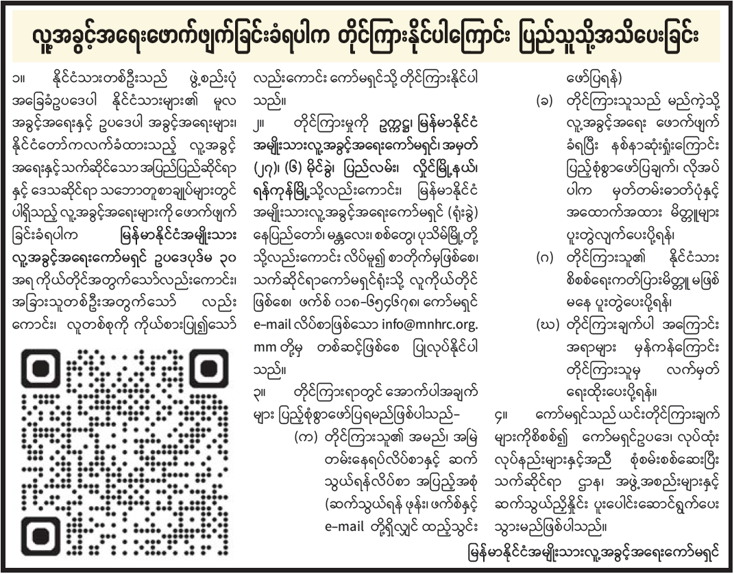 လူ့အခွင့်အရေးဖောက်ဖျက်ခြင်းခံရပါက တိုင်ကြားနိုင်ပါကြောင်း ပြည်သူသို့အသိပေးခြင်း