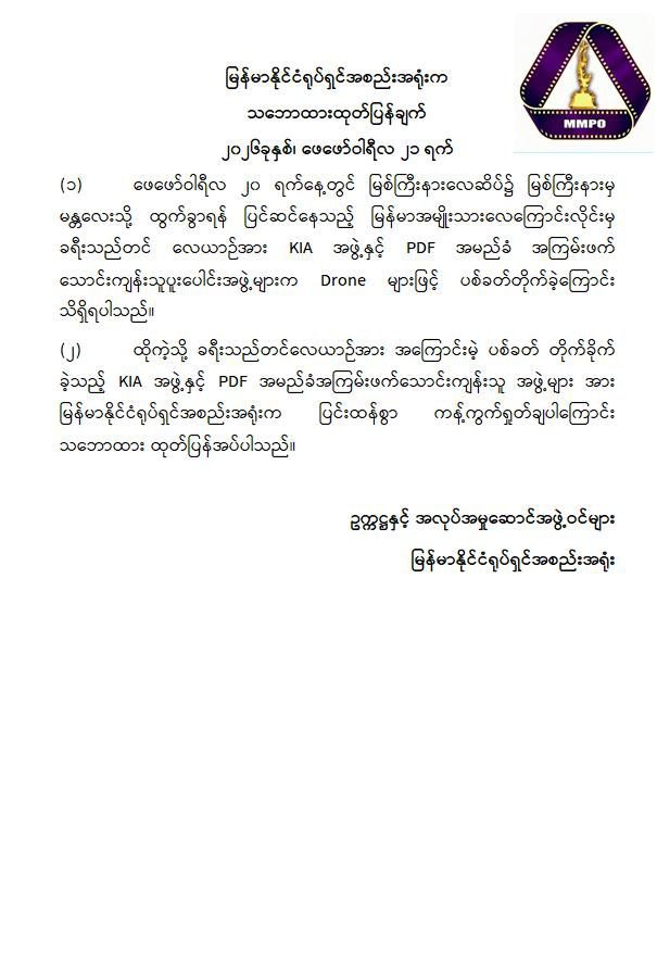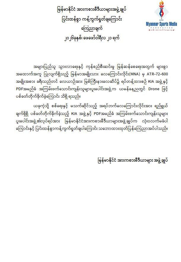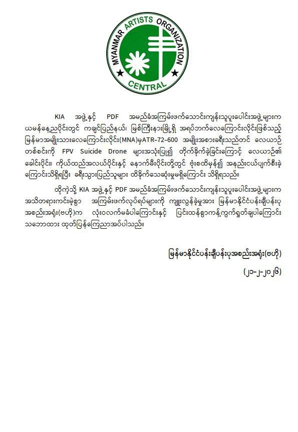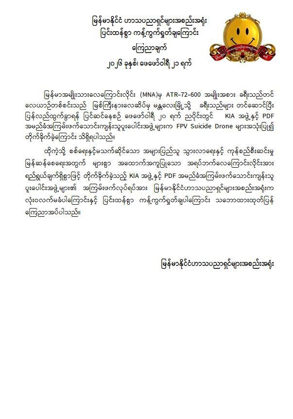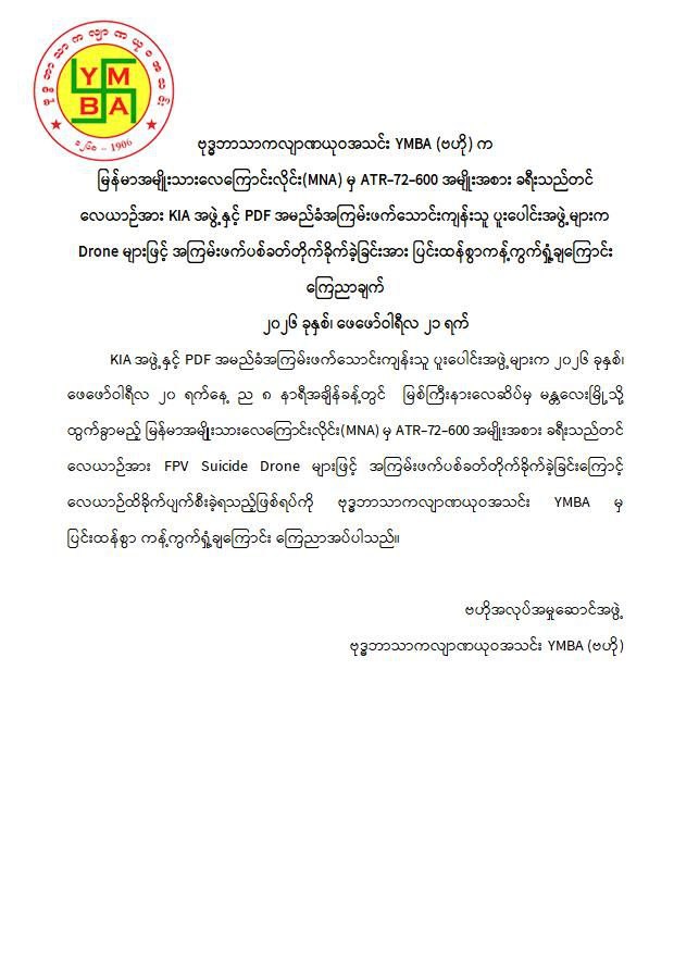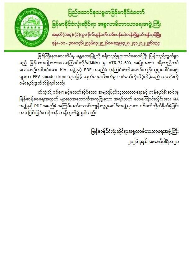 အဆိုပါ ကချင်ပြည်နယ်၏ အဓိကလေကြောင်းဗဟိုချက်တစ်ခုဖြစ်သော အများပြည်သူသွားလာရေးနှင့် ကုန်စည်စီးဆင်းမှုမြန်ဆန်စေရေးအတွက် များစွာအထောက်အကူပြုလျက်ရှိသည့် မြစ်ကြီးနားလေဆိပ်အား KIA အဖွဲ့နှင့် PDFအမည်ခံ အကြမ်းဖက် သောင်းကျန်းသူပူးပေါင်းအဖွဲ့များက ဖေဖော်ဝါရီ ၂၀ ရက် ည ၈ နာရီ ၁၂ မိနစ်ခန့်တွင် FPV Suicide Drone များအသုံးပြု၍ ခရီးသွားပြည်သူများ သေဆုံး၊ ထိခိုက်ဒဏ်ရာရရှိစေရန် ယုတ်မာပက်စက်သော ရည်ရွယ်ချက်ဖြင့် ပစ်ခတ်တိုက်ခိုက်ခဲ့သဖြင့် မြန်မာအမျိုးသားလေကြောင်းလိုင်း (MNA) မှ မြစ်ကြီးနားလေဆိပ်မှ မန္တလေးမြို့သို့ ထွက်ခွာရန်အတွက် ခရီးသည်များတင်ဆောင်ပြီး ပြန်လည်ထွက်ခွာရန် ပြင်ဆင်နေသည့် ATR-72-600 အမျိုးအစား ခရီးသည်တင်လေယာဉ်၏ ခေါင်းပိုင်း၊ ကိုယ်ထည်အလယ်ပိုင်းနှင့် နောက်မီးပိုင်းတို့တွင် ဗုံးစထိမှန်ပျက်စီးခဲ့ပြီး လေယာဉ်ခရီးစဉ်ရပ်နားခဲ့ရသည်။