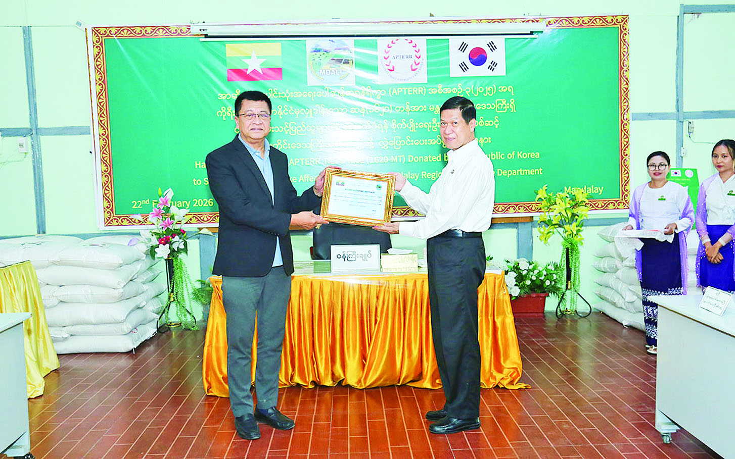 ယင်းနောက် တိုင်းဒေသကြီးဝန်ကြီးချုပ်က APTERR အတွင်းရေးမှူးချုပ်ရုံး အထွေထွေမန်နေဂျာနှင့် မြန်မာနိုင်ငံဆိုင်ရာ ကိုရီးယားသမ္မတနိုင်ငံသံရုံးမှ တာဝန်ရှိသူများထံ ဂုဏ်ပြုမှတ်တမ်းလွှာများ ပေးအပ်ပြီး ငလျင်ဘေးသင့်ပြည်သူတစ်ဦးက ကျေးဇူးတင်စကားပြောကြားသည်။ အဆိုပါဆန်တန်ချိန် ၁၆၂၀ ကို မန္တလေးတိုင်းဒေသကြီးအတွင်းရှိ ခရိုင်၊ မြို့နယ်များကို စနစ်တကျ ခွဲဝေပေးအပ်သွားမည်ဖြစ်ကြောင်း သိရသည်။