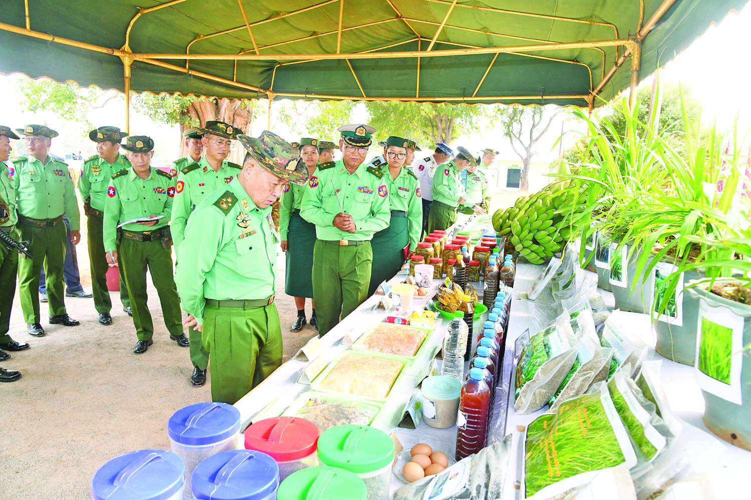 ထို့နောက် နိုင်ငံတော်လုံခြုံရေးနှင့် အေးချမ်းသာယာရေးကော်မရှင် ဒုတိယဥက္ကဋ္ဌ ဒုတိယတပ်မတော်ကာကွယ်ရေးဦးစီးချုပ်၊ ကာကွယ်ရေးဦးစီးချုပ်(ကြည်း)နှင့် အဖွဲ့ဝင်များသည် တိရစ္ဆာန်မွေးမြူရေးနှင့် လေ့ကျင့်ရေးတပ်ရင်းရှိ စံပြစိုက်ပျိုးမွေးမြူရေးဇုန်အတွင်း မြေစိုက်ရေခံအဆောက်အအုံနှင့် လေလုံအအေးပေးအဆောက်အအုံအတွင်း ဥစားကြက်များ မွေးမြူထားရှိမှု၊ Al သားစပ်ခြင်းမှ DYL မျိုးမြင့် သားပေါက်ဝက်များ၊ မျိုးမြင့်ဝက်သိုးနှင့် နို့စားနွားများ မွေးမြူထားရှိမှု၊ နေကြာပန်းများဝန်မှုံကူးမှု လွယ်ကူအဆင်ပြေစေရန်အတွက် ဆီနေကြာနှင့် ပျားအိမ်များ ယှဉ်တွဲစိုက်ပျိုးမွေးမြူထားရှိရာ အောင်မြင်ဖြစ်ထွန်းနေမှု၊ Green House အတွင်း ရာသီသီးနှံများ စိုက်ပျိုးထားရှိမှု၊ မျိုးစေ့ထုတ်ပိုးခန်းအတွင်း ရွှေဖရုံ၊ ဗူး၊ တိုင်ထောင်ပဲ၊ ငရုတ်၊ ရုံးပတီ၊ မုန့်ညင်းနှင့် ခရမ်းများကို မျိုးကောင်းမျိုးသန့်များအဖြစ် အဆင့်ဆင့်မျိုးစေ့များ ထုတ်ပိုးနေမှုနှင့် သိုလှောင်ခန်းအတွင်း မျိုးစေ့များ သိုလှောင်ထားရှိမှု၊ ကျောက်စိမ်း၊ တစ်သျှူး၊ သီးမွှေးငှက်ပျောစိုက်ပျိုးထားရှိမှုများ၊ မျိုးစေ့များ ခင်းကျင်းပြသထားရှိမှု၊ လား/မြင်းချေးမှ သဘာဝမြေဆွေး စမ်းသပ်ထုတ်လုပ်ထားရှိမှုများ၊ ရောဂါကာကွယ်ဆေးများ၊ ထောက်ပံ့နှင့် ပို့ဆောင်ရေးညွှန်ကြားရေးမှူးရုံး ကွပ်ကဲမှုအောက် အစာစပ်စက်ရုံမှ ထုတ်လုပ်သည့် တိရစ္ဆာန်အစားအစာများ ခင်းကျင်းပြသထားရှိမှု၊ ဗထူးစမ်းမှ ဆိုလာရေတင်စနစ်ဖြင့် စိုက်ပျိုးထားသည့် နေကြာ ၁၀ ဧကမှ နေကြာဆီများ ထုတ်လုပ်အောင်မြင်ဖြစ်ထွန်းနေမှုများကို လိုက်လံကြည့်ရှုစစ်ဆေးပြီး သိရှိလိုသည်များကို မေးမြန်းဆွေးနွေးကာ လိုအပ်သည်များအား တာဝန်ရှိသူများနှင့်အတူ ပေါင်းစပ်ညှိနှိုင်းဆောင်ရွက်ပေးသည်။