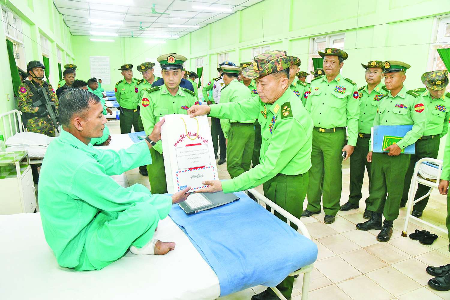 ယင်းနောက် နိုင်ငံတော်လုံခြုံရေးနှင့် အေးချမ်းသာယာရေးကော်မရှင် ဒုတိယဥက္ကဋ္ဌ ဒုတိယတပ်မတော်ကာကွယ်ရေးဦးစီးချုပ်၊ ကာကွယ်ရေးဦးစီးချုပ်(ကြည်း)နှင့် အဖွဲ့ဝင်များသည် ဆေးရုံတက်ရောက်ဆေးကုသမှုခံယူလျက်ရှိသည့် အရာရှိ၊ စစ်သည်များအား လိုက်လံကြည့်ရှုပြီး တစ်ဦးချင်း၏ ရောဂါဖြစ်ပွားမှုအခြေအနေများကို လိုက်လံမေးမြန်းအားပေးစကား ပြောကြားကာ စားသောက်ဖွယ်ရာများပေးအပ်သည်။