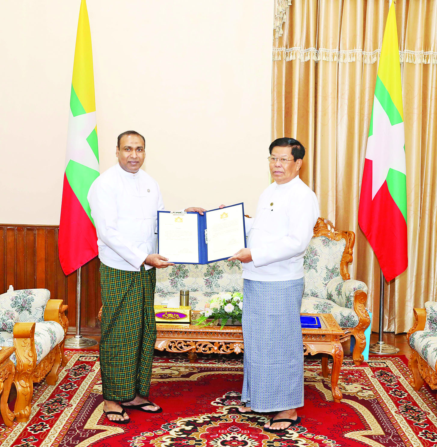 ပြည်ထောင်စုဝန်ကြီး ဦးသန်းဆွေ မြန်မာနိုင်ငံဆိုင်ရာ အိုက်စလန်နိုင်ငံ ဂုဏ်ထူးဆောင်ကောင်စစ်ဝန်အဖြစ် ခန့်အပ်ရန် သဘောတူပြီးဖြစ်သော ဦးကိုကိုလတ်၏ ခန့်အပ်လွှာကိုလက်ခံ၍ အသိအမှတ်ပြုစာချွန်လွှာ ပြန်လည်ပေးအပ်