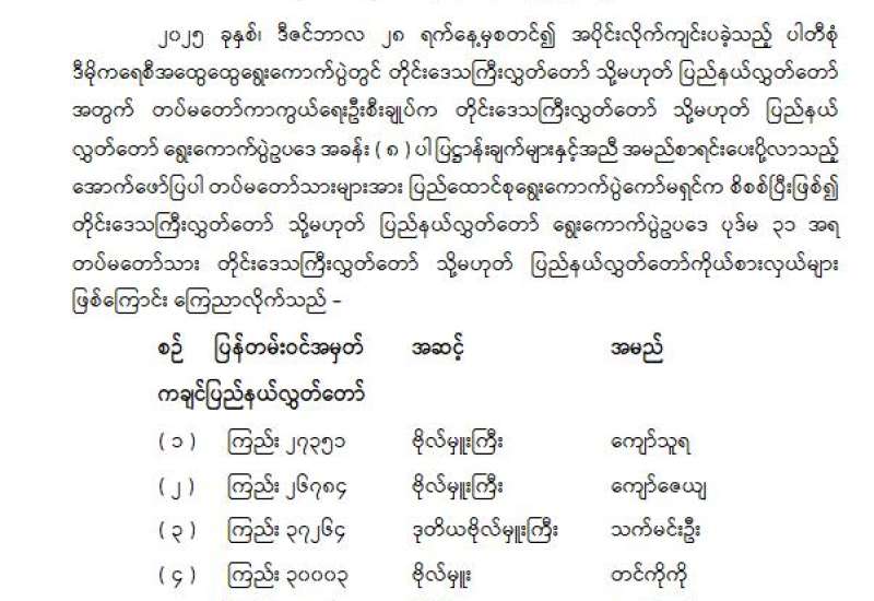 တပ်မတော်သား တိုင်းဒေသကြီးလွှတ်တော် သို့မဟုတ် ပြည်နယ်လွှတ်တော် ကိုယ်စားလှယ်အမည်စာရင်းကြေညာခြင်း