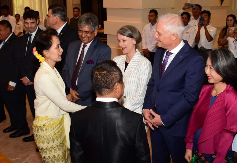 နိုင်ငံတော်၏အတိုင်ပင်ခံပုဂ္ဂိုလ် ဒေါ်အောင်ဆန်းစုကြည်သည် ယနေ့မွန်းလွဲပိုင်းတွင် နေပြည်တော်ရှိ Hilton Hotel ၌ ကျင်းပသည့်  မြန်မာနိုင်ငံဆိုင်ရာ နိုင်ငံတကာသံတမန်များကိုယ်စား သံတမန်များအဖွဲ့နာယက တီမောလက်စ်တေ သံအမတ်ကြီး မစ္စတာ ဂျူဝေါင်း ဖရေးတက်စ် ဒေ ကာမာရာ က တည်ခင်းဧည့်ခံသည့် နှစ်သစ်ကူးအခါသမယနှင့် ပြည်ထောင်စုသမ္မတမြန်မာနိုင်ငံတော်၏ (၇၂)နှစ်မြောက် လွတ်လပ်ရေးနေ့အခါသမယကို ကြိုဆိုသည့် ဂုဏ်ပြုနေ့လယ်စာစားပွဲသို့ တက်ရောက်သည်။