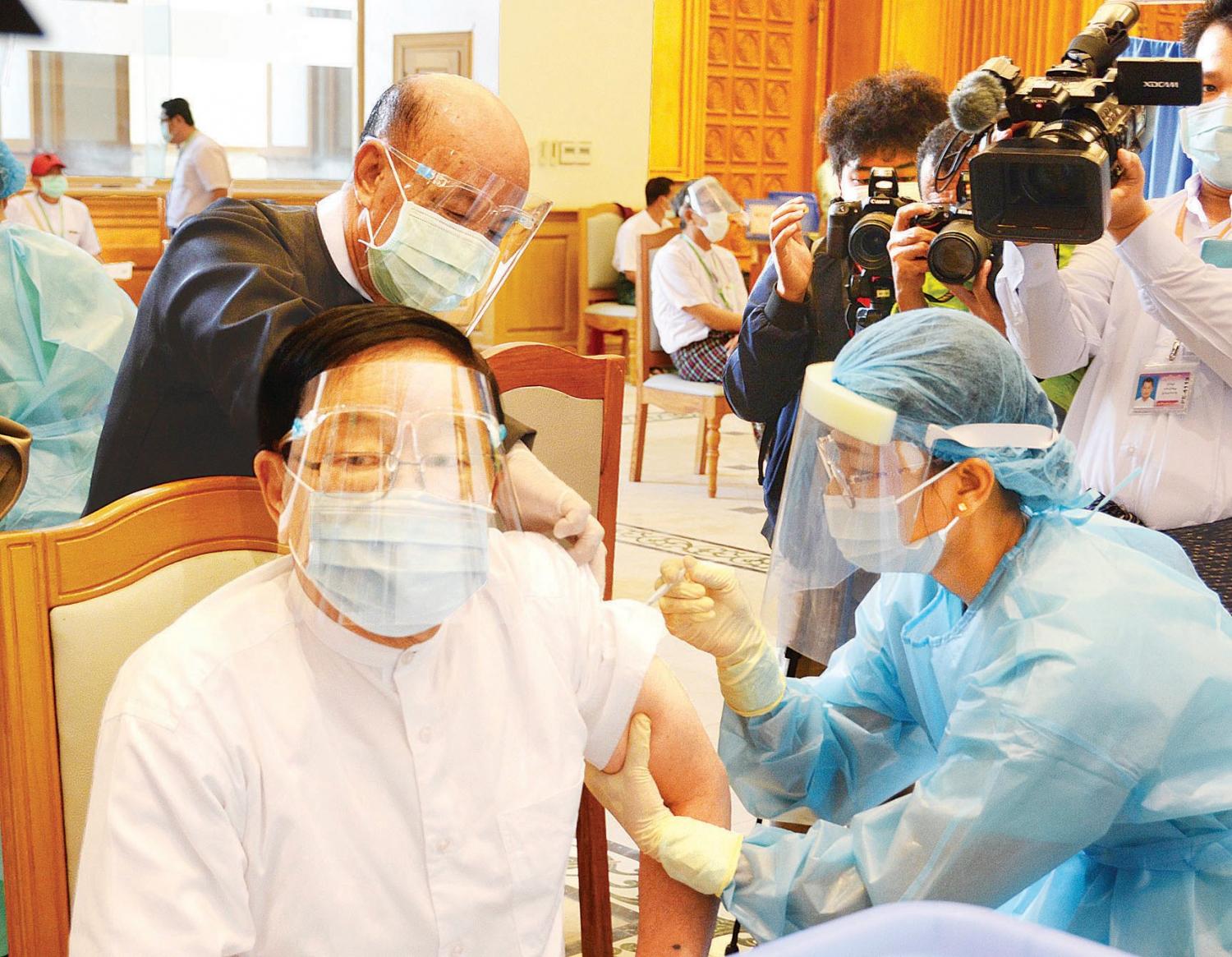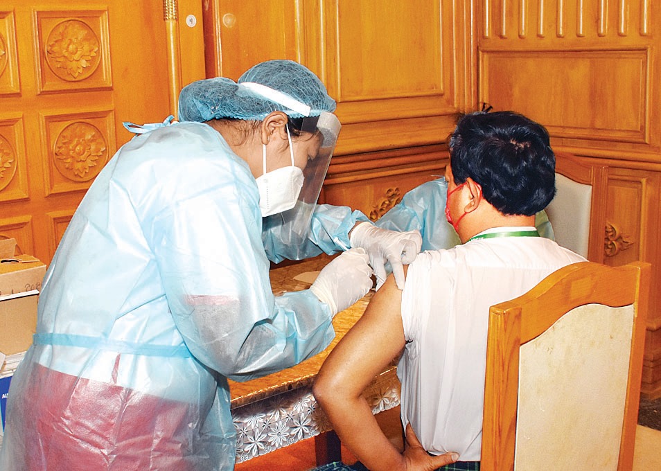 ကိုဗစ်-၁၉ ကာကွယ်ဆေးထိုးနှံခြင်းနှင့်စပ်လျဉ်း၍ နေပြည်တော် ပြည်သူ့ကျန်းမာရေးဦးစီး ဌာနမှူး ဒုတိယညွှန်ကြားရေးမှူးချုပ် ဒေါက်တာမြတ်ဝဏ္ဏစိုး က “ဒီနေ့က ပြည်သူ့လွှတ်တော် ကိုယ်စားလှယ်တွေကို ကာကွယ်ဆေးထိုးပေးတာ ဖြစ်ပါတယ်။ အခုဆေးလာထိုးတဲ့ ကိုယ်စားလှယ် တွေကို သူတို့နေပြည်တော်ကိုရောက်တဲ့ ၂၃ ရက်က တစ်ကြိမ်၊ ၂၈ ရက်က တစ်ကြိမ် Swab Test ယူပြီး ကိုဗစ်-၁၉ ရောဂါ ရှိ၊ မရှိ စစ်ဆေးထားပြီးဖြစ်ပါတယ်။ နှစ်ကြိမ်လုံး Negative ဖြစ်ထားတဲ့ ကိုယ်စားလှယ်တွေကို ဆေးထိုးပေးနေတာ ဖြစ်ပါတယ်။ ကိုဗစ်-၁၉ ကာကွယ်ဆေးထိုးတဲ့အခါမှာလည်း ဆေးမထိုးခင် ကျွန်တော်တို့က သွေးပေါင်ချိန်တိုင်းတယ်။ အပူချိန်တိုင်းတယ်။ သွေးထဲမှာပါဝင်တဲ့ အောက်ဆီဂျင် ပမာဏကို တိုင်းတယ်။ လိုအပ်ရင် သက်ဆိုင်ရာ သမားတော်တွေနဲ့ ပြပေးပါတယ်။ ဆေးထိုးလို့ရတယ်ဆိုမှ ကျွန်တော်တို့ဆေးထိုးပေးပါတယ်။ ဆေးထိုးပြီးတဲ့ အခါမှာလည်း ကိုယ်စား လှယ်ကြီးတွေကို နာရီဝက်စောင့်ဆိုင်းပြီး အန္တရာယ်မရှိဘူးဆိုတော့မှ အဆောင်ကို ပြန်စေပါတယ်။ အဆောင်မှာလည်း လိုအပ်တဲ့ Medical Cover ဆောင်ရွက်ပေးထားပါတယ်။