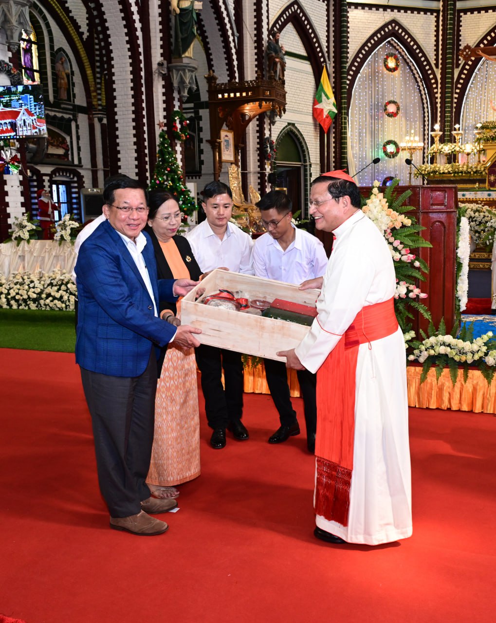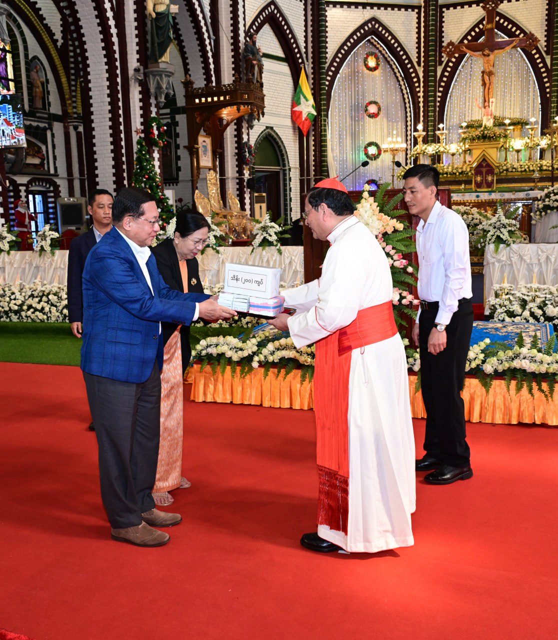 ယင်းနောက် နိုင်ငံတော်ယာယီသမ္မတ နိုင်ငံတော်လုံခြုံရေးနှင့်အေးချမ်းသာယာရေးကော်မရှင်ဥက္ကဋ္ဌနှင့် ဇနီးတို့ထံ ဂိုဏ်းချုပ်ဆရာတော်ကြီး ကာဒီနယ်ချားလ်စ်ဘို၊ သာသနာပိုင်ချုပ်ကြီး စတီဗင်သန်းမြင့်ဦးနှင့် သိက္ခာတော်ရဆရာ ဒေါက်တာအေးမင်းတို့က ခရစ္စမတ်အမှတ်တရမေတ္တာလက်ဆောင်၊ ခရစ္စမတ်ဆုတောင်းလွှာနှင့် ကျောက်စီပန်းချီကားကို ပေးအပ်ရာ နိုင်ငံတော်ယာယီသမ္မတ နိုင်ငံတော်လုံခြုံရေးနှင့်အေးချမ်းသာယာရေးကော်မရှင်ဥက္ကဋ္ဌနှင့် ဇနီးတို့က ခရစ္စမတ် အထိမ်းအမှတ်လက်ဆောင်များကို ပြန်လည်ပေးအပ်သည်။