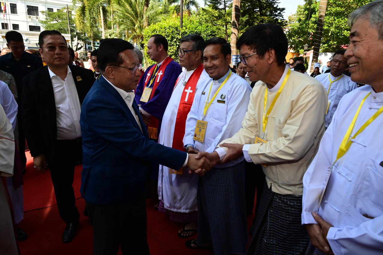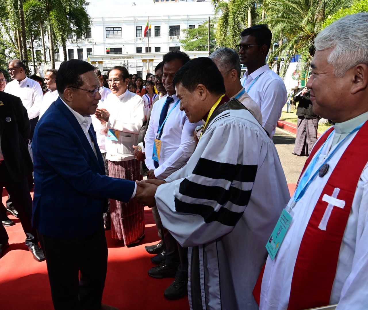 ယင်းနောက် နိုင်ငံတော်ယာယီသမ္မတ နိုင်ငံတော်လုံခြုံရေးနှင့်အေးချမ်းသာယာရေးကော်မရှင်ဥက္ကဋ္ဌနှင့် ဇနီး၊ အဖွဲ့ဝင်များသည် အခမ်းအနားဒုတိယပိုင်း ကျင်းပမည့် ဘုရားကျောင်းတော်အတွင်းသို့ ရောက်ရှိကြရာ မြန်မာနိုင်ငံခရစ်ယာန်ကောင်စီမှ ဆရာတော်ကြီးများ၊ မြန်မာနိုင်ငံကက်သလစ်သာသနာမှ ဆရာတော်ကြီးများ၊ မြန်မာနိုင်ငံဧဝံဂေလိခရစ်ယာန်မဟာမိတ်အဖွဲ့ချုပ်မှ ဆရာတော်ကြီးများ၊ မြန်မာနိုင်ငံခရစ်တော်သာသနာပြန့်ပွားမှု ပူးပေါင်းဆောင်ရွက်ရေးအဖွဲ့ချုပ်မှ ဆရာတော်ကြီးများ၊ ဘာသာပေါင်းစုံချစ်ကြည်ရေးအဖွဲ့မှ တာဝန်ရှိသူများက ကြိုဆိုနှုတ်ဆက်ကြသည်။