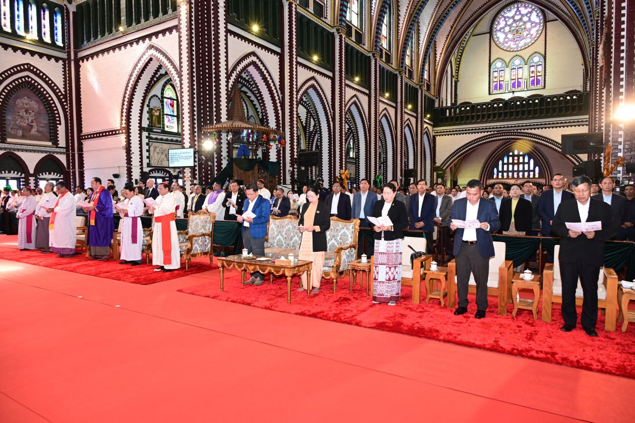 မြန်မာနိုင်ငံခရစ်ယာန်အသင်းတော်ပေါင်းစုံအဖွဲ့ချုပ်ကြီးများက ကြီးမှူးကျင်းပသည့် ခရစ်တော်မွေးနေ့ (ခရစ္စမတ်) ကျေးဇူးတော် ချီးမွမ်းခြင်းနှင့် မိတ်သဟာယမိတ်ဆုံစားပွဲအခမ်းအနားကို ယနေ့နံနက်ပိုင်းတွင် ရန်ကုန်တိုင်းဒေသကြီး၊ ဗိုလ်တထောင်မြို့နယ်ရှိ စိန့်မေရီကာသီဒြယ်ကက်သလစ်ဘုရားကျောင်းတော်ကြီး၌ ကျင်းပပြုလုပ်ရာ ပြည်ထောင်စုသမ္မတမြန်မာနိုင်ငံတော်ယာယီသမ္မတ နိုင်ငံတော်လုံခြုံရေးနှင့်အေးချမ်းသာယာရေးကော်မရှင်ဥက္ကဋ္ဌ ဗိုလ်ချုပ်မှူးကြီး မင်းအောင်လှိုင် တက်ရောက်ချီးမြှင့်သည်။