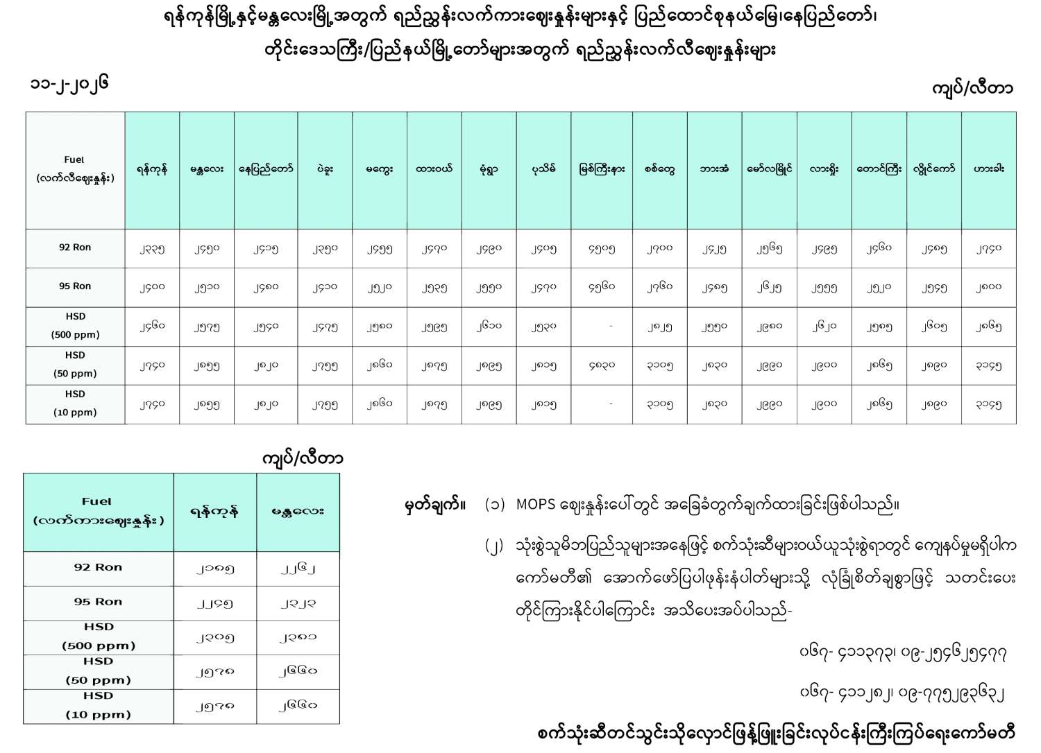 ရန်ကုန်မြို့နှင့် မန္တလေးမြို့အတွက် ရည်ညွှန်းလက်ကားဈေးနှုန်းများနှင့် ပြည်ထောင်စုနယ်မြေ နေပြည်တော်၊ တိုင်းဒေသကြီး/ ပြည်နယ် မြို့တော်များအတွက် ရည်ညွှန်းလက်လီဈေးနှုန်းများ
