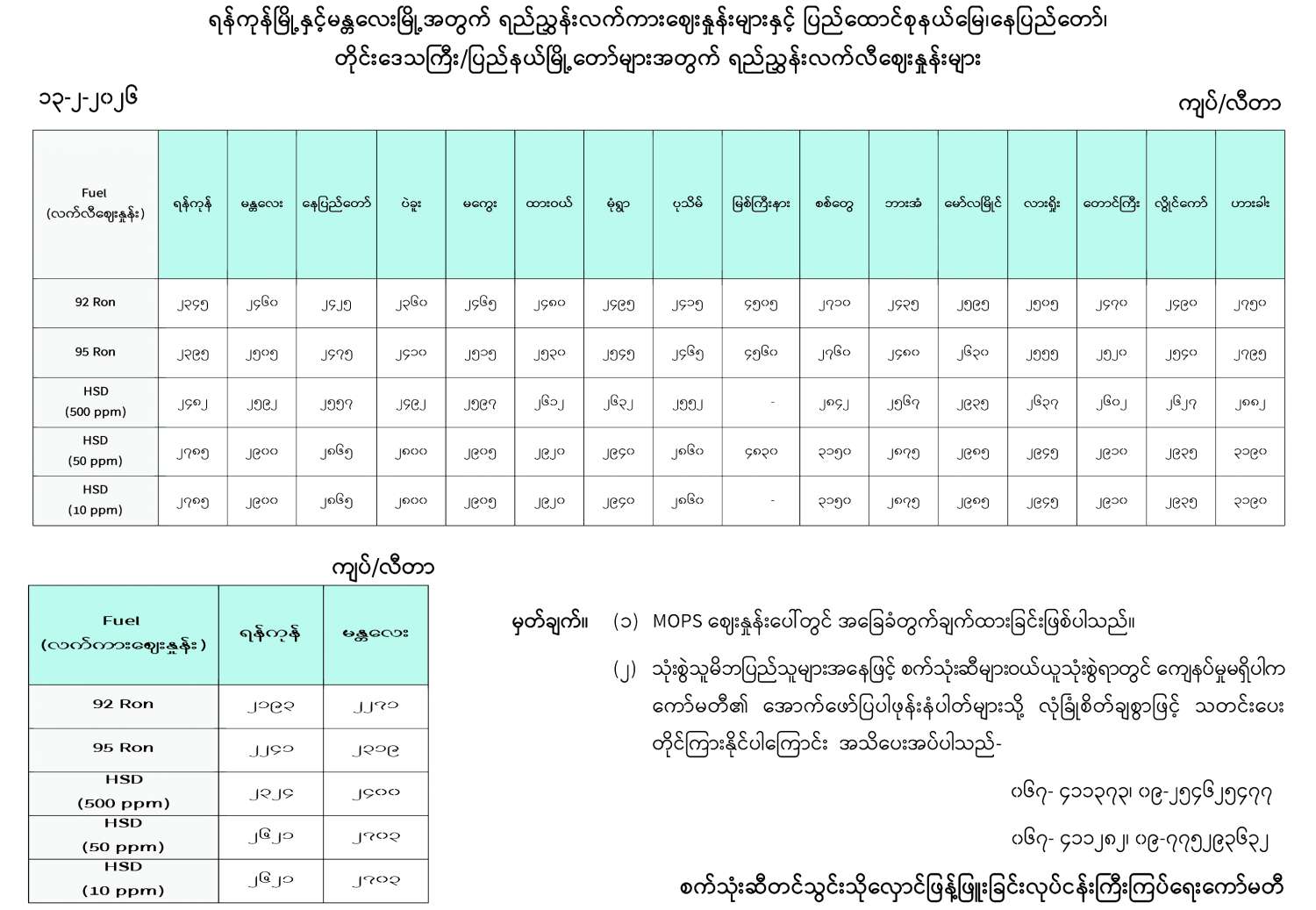 ရန်ကုန်မြို့နှင့် မန္တလေးမြို့အတွက် ရည်ညွှန်းလက်ကားဈေးနှုန်းများနှင့် ပြည်ထောင်စုနယ်မြေ နေပြည်တော်၊ တိုင်းဒေသကြီး/ပြည်နယ် မြို့တော်များအတွက် ရည်ညွှန်းလက်လီဈေးနှုန်းများ 02/13/2026