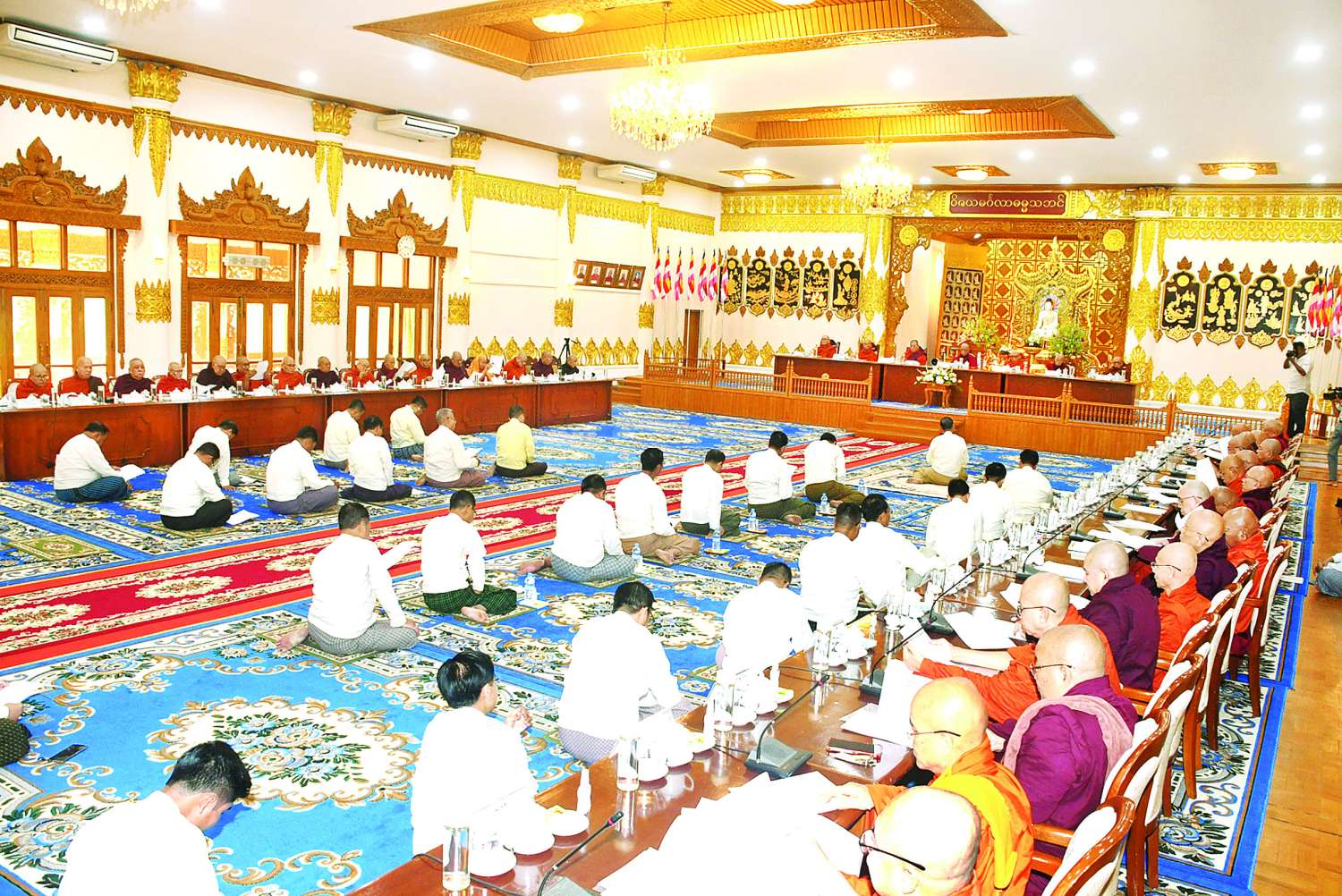 အစည်းအဝေးသို့ နိုင်ငံတော်သံဃမဟာနာယကအဖွဲ့ဥက္ကဋ္ဌ သန်လျင်မြို့ မင်းကျောင်းပထမပြန်စာသင်တိုက်၊ ပဓာနနာယက ဆရာတော် အဘိဓဇမဟာရဋ္ဌဂုရု အဂ္ဂမဟာသဒ္ဓမ္မဇောတိကဓဇ ဒေါက်တာဘဒ္ဒန္တစန္ဒိမာဘိဝံသအမှူးပြုသည့် နိုင်ငံတော်သံဃမဟာနာယကအဖွဲ့ ဆရာတော်ကြီးများ၊ သာသနာရေးနှင့် ယဉ်ကျေးမှုဝန်ကြီးဌာန ပြည်ထောင်စုဝန်ကြီး ဦးတင်ဦးလွင်၊ သာသနာရေးဦးစီးဌာန ညွှန်ကြားရေးမှူးချုပ်၊ သာသနာတော်ထွန်းကားပြန့်ပွားရေးဦးစီးဌာန ညွှန်ကြားရေးမှူးချုပ်၊ အပြည်ပြည်ဆိုင်ရာထေရဝါဒဗုဒ္ဓသာသနာပြုတက္ကသိုလ် ဒုတိယပါမောက္ခချုပ်(စီမံ)နှင့် တိုင်းဒေသကြီး/ ပြည်နယ် သာသနာရေးမှူးများ တက်ရောက်ကြည်ညိုကြသည်။