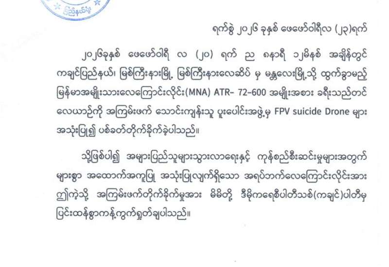 ကချင်ပြည်နယ်၏ အဓိကလေကြောင်းဗဟိုချက်တစ်ခုဖြစ်သော အများပြည်သူသွားလာရေးနှင့် ကုန်စည်စီးဆင်မှုမြန်ဆန်စေရေးအတွက် များစွာအထောက်အကူပြုလျက်ရှိသည့် မြစ်ကြီးနားလေဆိပ်အား KIA အဖွဲ့နှင့် PDF အမည်ခံ အကြမ်းဖက်သောင်းကျန်းသူပူးပေါင်းအဖွဲ့များက ဖေဖော်ဝါရီ ၂၀ ရက် ည ၈ နာရီ ၁၂ မိနစ်ခန့်တွင် FPV Suicide Drone များအသုံးပြု၍ ခရီးသွားပြည်သူများ သေဆုံး၊ ထိခိုက်ဒဏ်ရာရရှိစေရန် ယုတ်မာပက်စက်သော ရည်ရွယ်ချက်ဖြင့် ပစ်ခတ်တိုက်ခိုက်ခဲ့မှုအပေါ် ဒေသခံပြည်သူများအပြင် တစ်နိုင်ငံလုံးရှိ ပြည်သူလူထုတစ်ရပ်လုံးကပါ လုံးဝလက်ခံနိုင်ခြင်းမရှိဘဲ အဖွဲ့အစည်းအသီးသီးမှလည်း ကန့်ကွက်ရှုတ်ချလျက်ရှိကြပြီး ပြည်ထောင်စုသမ္မတမြန်မာနိုင်ငံတော် ကချင်ပြည်နယ်အထူးဒေသ(၁)၊ ထာဝရငြိမ်းချမ်းရေးအဖွဲ့ချုပ် ဦးဆောင်ကော်မတီနှင့် ဒီမိုကရေစီပါတီသစ်(ကချင်)ပါတီတို့ကလည်း ပြင်းထန်စွာကန့်ကွက်ရှုတ်ချပါကြောင်း အောက်ပါအတိုင်း သဘောထားများ အသီးသီးထုတ်ပြန်ခဲ့ကြကြောင်း သိရှိရသည်။